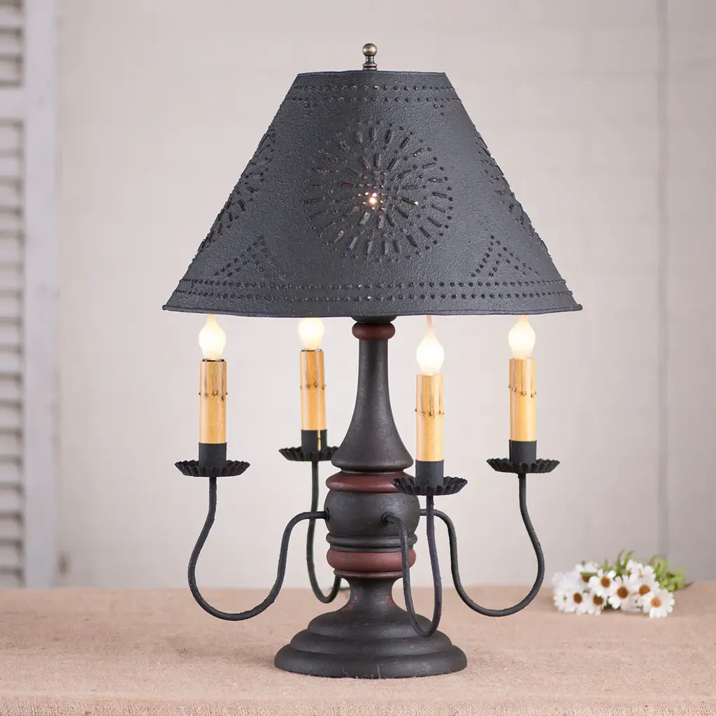 4 candelabra arms, 60 watts max per socket. Center light has a standard socket, 150 watts max. 3-way switch. Heavily distressed and cracked paint on body and textured paint on arms and shade.Bulbs Not Included