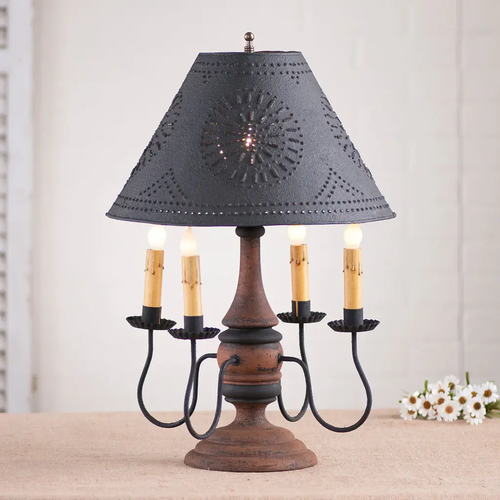 Measures 25.5-Inch high and 15-Inch diameterHas a 7-foot cord and line switch; Plugs into wall outlet; Top center has a standard socket, 1 x 150 watts max; Arms have candelabra sockets, 4 x 60 watts max. UL listed for dry locationsHeavily distressed pumpkin over black with black stripe paint finish; Black textured shade includedLamp Base is made in the USA, Shade is ImportedA finely crafted table lamp with four E12/Candelabra arms and a E26/Medium (Standard) socket on top with three way lighting capability. Our Jamestown Lamp exudes a genteel country feeling like that on a gentleman''s farm or a plantation of the Old South.Four E12/Candelabra arms, 60 watts max per socket. Center light has a E26/Medium (Standard) socket, 150 watts max. 3-way switch. Heavily distressed and crackled Hartford Pumpkin with black stripe body color and textured black arms with crimped pans. Handcrafted in Pennsylvania. Includes a 15-Inch Textured Black Flared Shade #925-2CBK. Lamp base without shade and alternate shade options are shown under related items below.