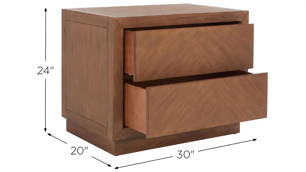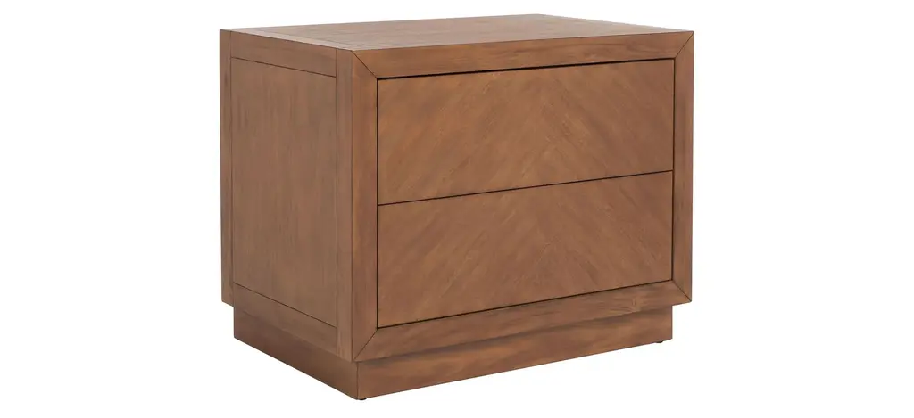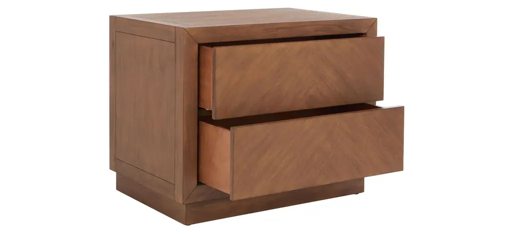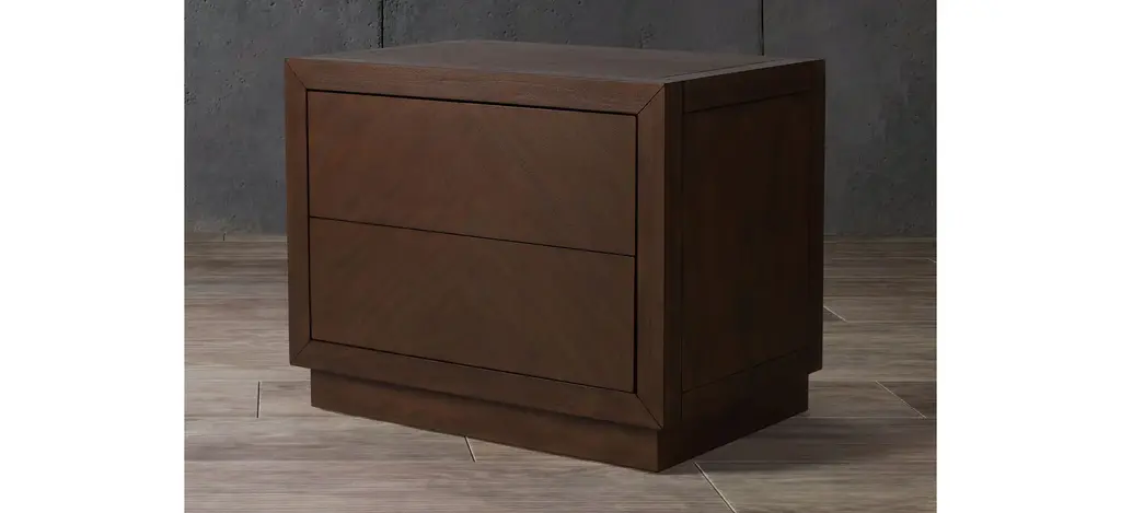 Stylishly understated yet thoroughly sophisticated, this Jamie Nightstand is perfectly designed for today's contemporary bedrooms. The subtle herringbone pattern on its two drawers is beautifully showcased in rich brown mahogany wood, seamlessly accenting any room's color scheme.