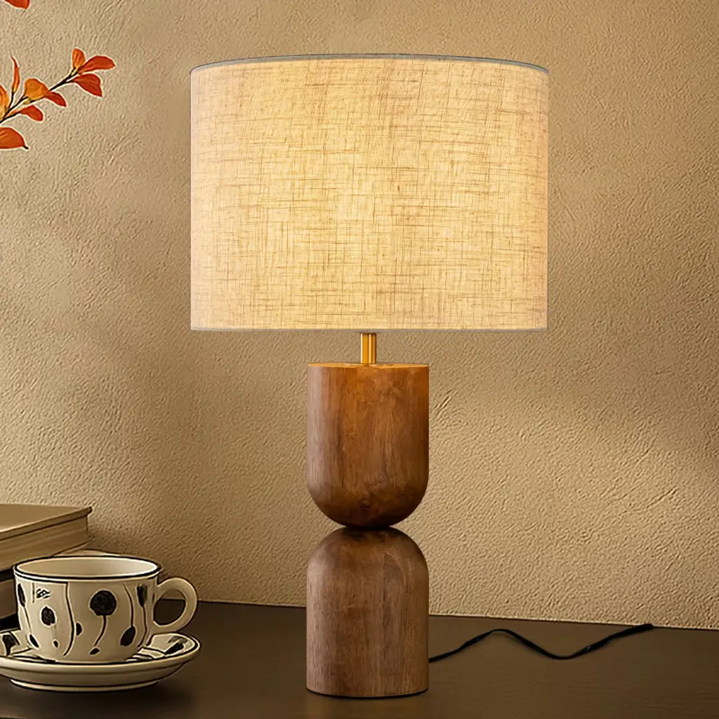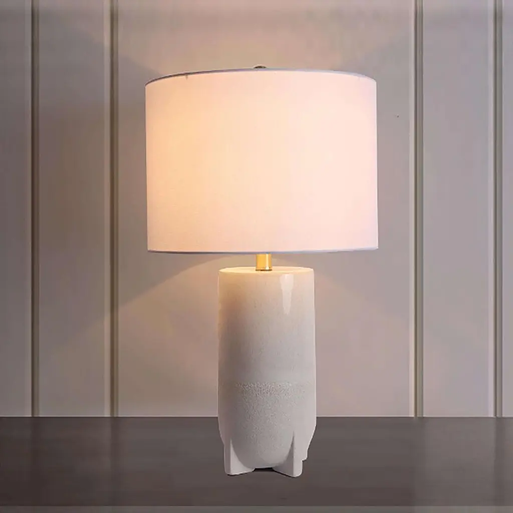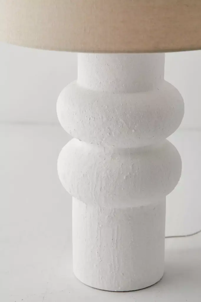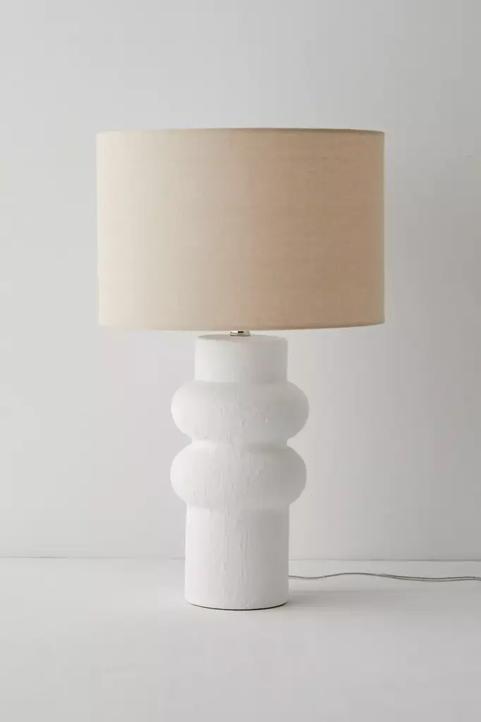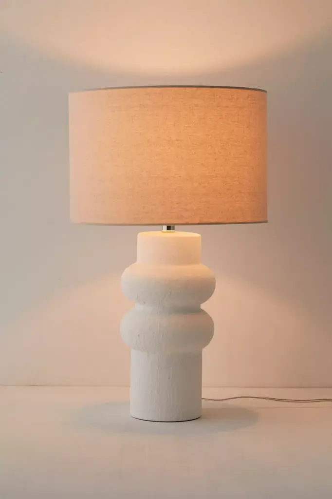 Bring modern appeal to your lighting display with this table lamp featuring a sculptural base with a playful, bubbled silhouette. Complete with a stucco-like textural finish and topped with a linen drum shade that adds a minimalist feel we love. Plugs in to power on. **Features** \- Modern-minimalist table lamp \- Sculptural bubbled base \- Linen drum shade \- Plug in \- Rotary switch \- Requires one E26 bulb - not included **Content + Care** \- 80% Stoneware, 10% linen, 5% iron, 5% plastic \- Wipe clean \- Imported \- Made in compliance with US electrical standards. To use this item outside of the US, pair with an outlet adapter and voltage converter made specifically for use in your location. **Size** \- Wattage: 100W \- Dimensions: 15"l x 15"w x 25"h \- Base dimensions: 7"l x 7"w x 14.5"h \- Shade dimensions: 15"l x 15"w x 10"h \- Cord length: 8 ft \- Weight: 7.04 lbs \- Shipping package dimensions: 15.7"l x 15.7"w x 25"h \- Shipping package weight: 8.8 lbs