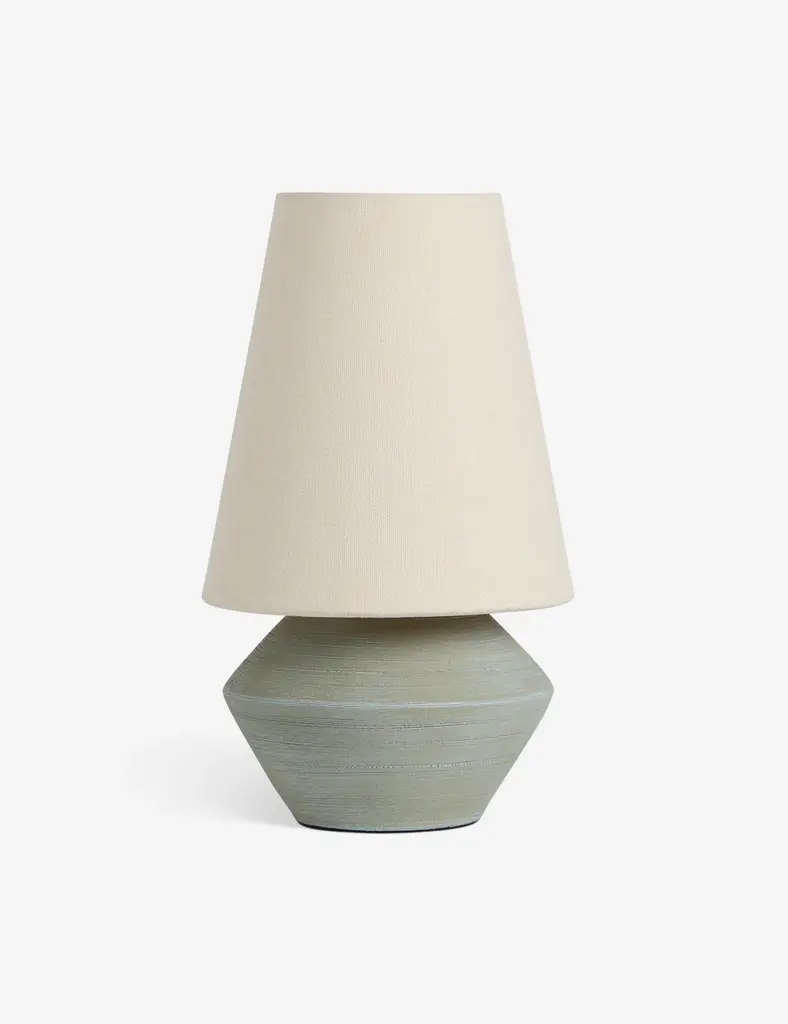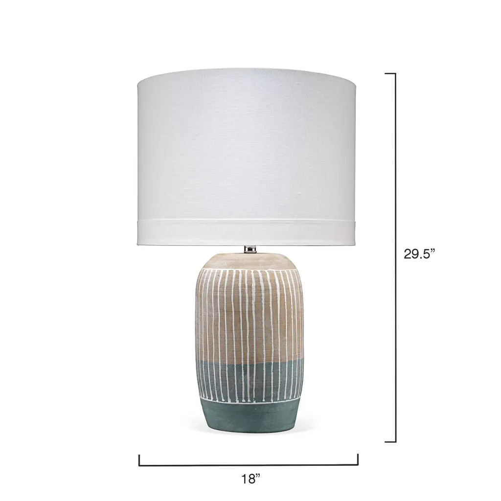 Drawing inspiration from the natural textures and neutral tones of the desert. The table lamp's body is hand-molded of natural ceramic, its brown-and-blue palette lined in a white glaze for geometric dimension. Each lamp features a unique form and finish for one-of-a-kind character in your living space, library or bedroom. •Handmade of ceramic•100% Linen White Drum Shade•Striped Geometric Pattern•Silver Ball Finial•Silver Spider and Harp The handcrafted nature of ceramic creates products with character and individuality. The inherent variations in tone or texture, are preserved, to create pieces rich in detail and natural beauty. These unique imperfections and variations are what define our products, with each piece having its own personality. •Lamp Dimensions: 16.5"H x 7" Diameter Footprint• Shade Dimensions: 13"H x 18"W x 18"D• 1 bulb required; Bulb Not Included• 150 Max Wattage; 120 Volts• E26 Bulb Base Type • 8 Ft Clear Cord• 3-way Switch We do not recommend using harsh or abrasive cleaners at any time as they can damage product. Wipe surfaces gently with soft, dry cloth. If needed, you may use a lightly damp cloth with water only on base.