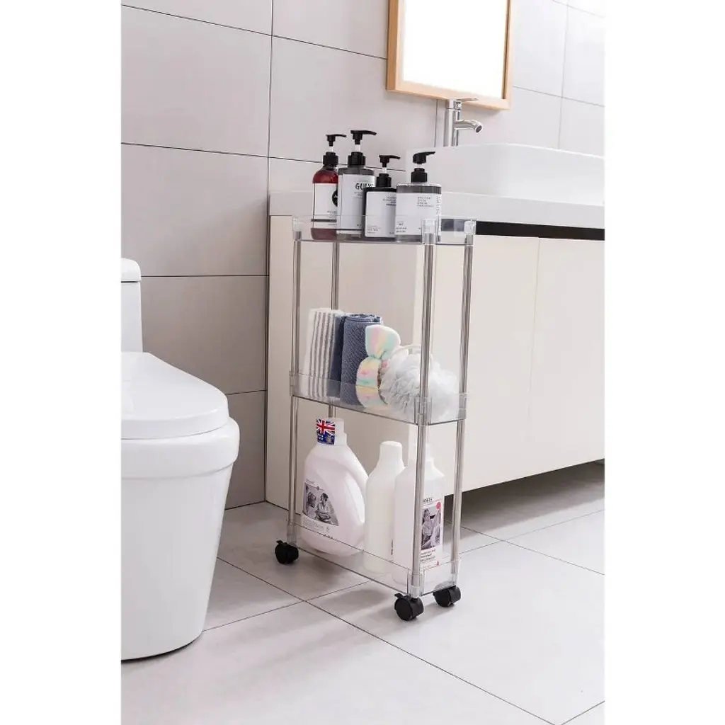 Transform your space with this versatile 3-tier rolling cart. Perfect for bathrooms, kitchens, offices, or any room needing stylish organization, this clear acrylic cart combines functionality with modern aesthetics. Each of the three sturdy shelves provides ample storage space for various items, while the sleek metal frame ensures stability. The cart features smooth-rolling casters with locks for secure positioning, and an integrated handle makes it easy to move around. Assembly is straightforward, allowing you to start organizing right away. The transparent acrylic construction lets you easily spot items on each level while maintaining a light, unobtrusive presence in your space. Whether storing bathroom essentials, kitchen supplies, office materials, or craft items, this multipurpose cart adapts to your needs while keeping everything tidy and accessible. The cart's compact design makes it ideal for maximizing storage in tight spaces without sacrificing style or functionality.