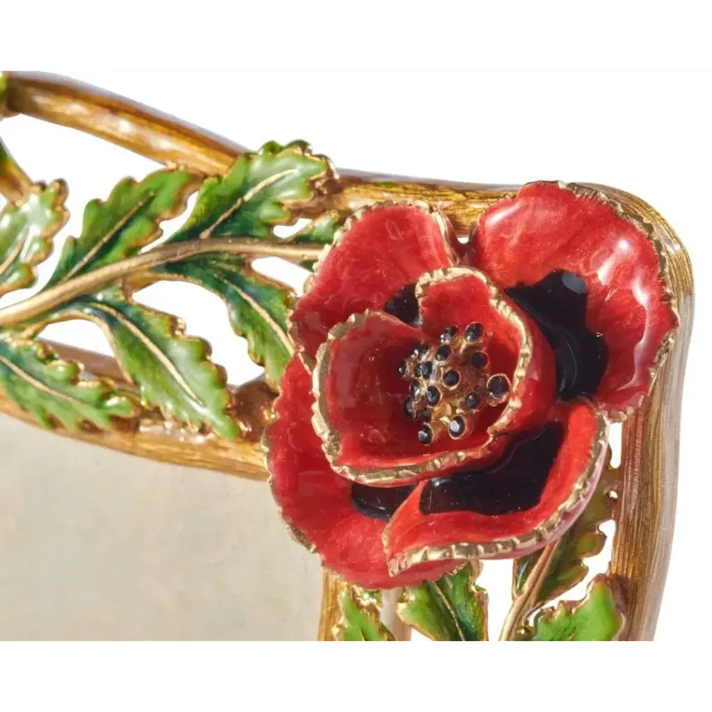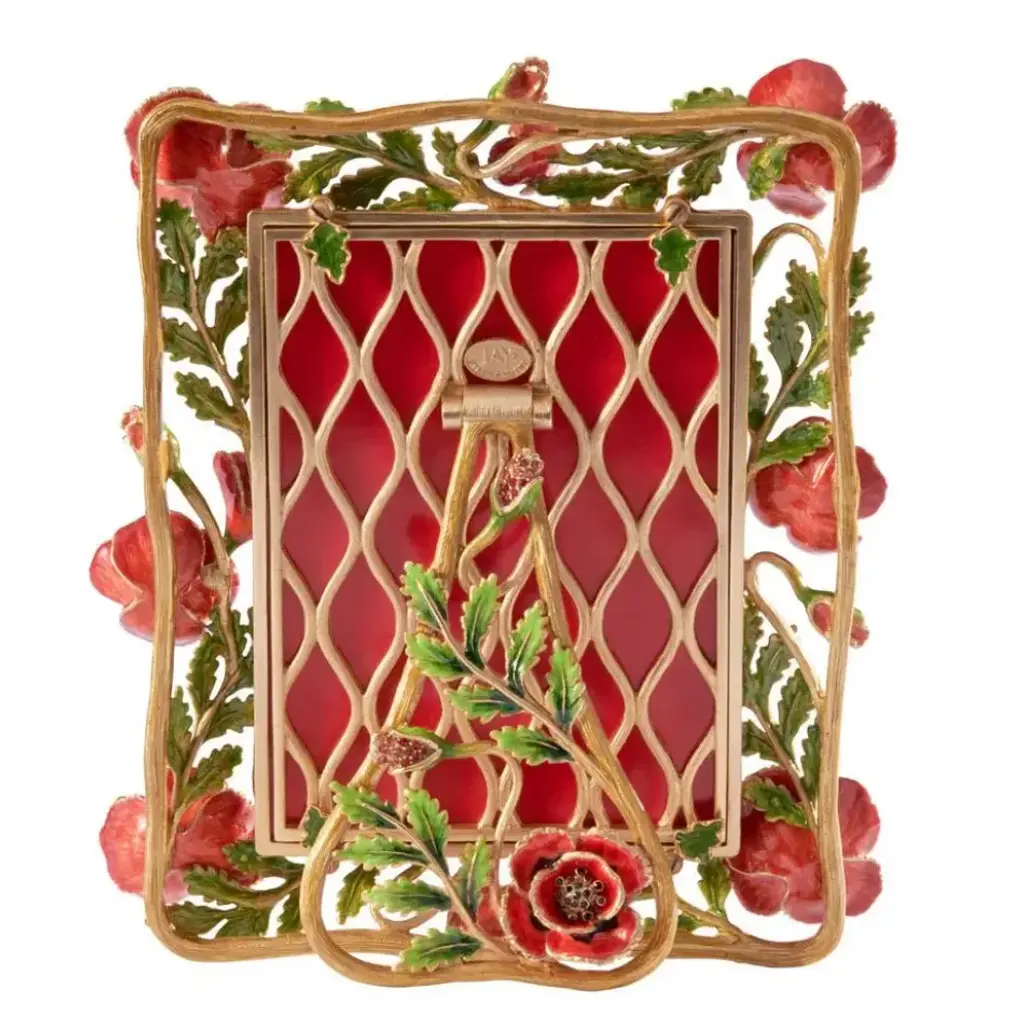 Showcase your cherished memories with this elegant frame. The Jane Poppy Frame is brought to life with14 expertly placed castings. Over a span of five hours, our skilled artisans meticulously apply eight different enamels and more than 250 exquisite crystals to create this stunning piece.