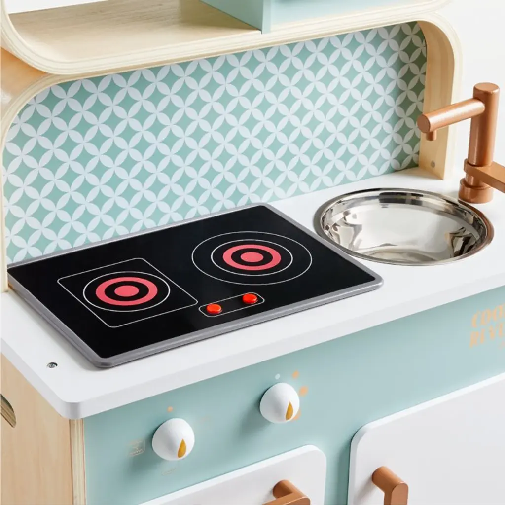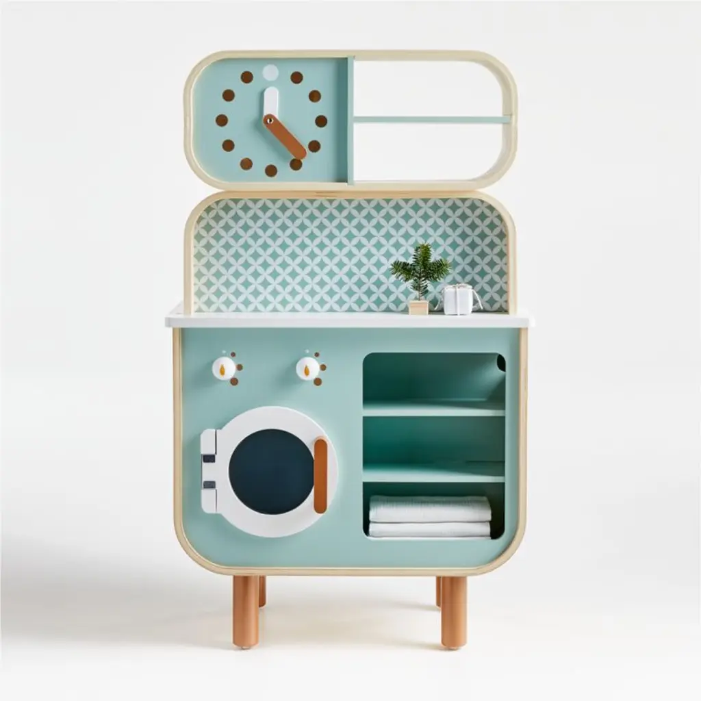 A dream play set for any growing foodie or mini chef, the double-sided Janod Cooker Reverso has a kitchen on one side and a pantry/washing machine on the reverse. Made for hours of imaginary play, the detail-packed design includes a clock with functional hands, metal sink and stovetop with light/sound effects. There's also a play oven, microwave and cupboard with magnetic doors. Plus, the reverse side features a play washing machine with sound-effect buttons and storage shelves for toy food. With soft hues, playful curves and a modern look, it's a thoughtfully designed piece for the playroom. WARNING: CHOKING HAZARD – Small parts. Not for children under 3 yrs.