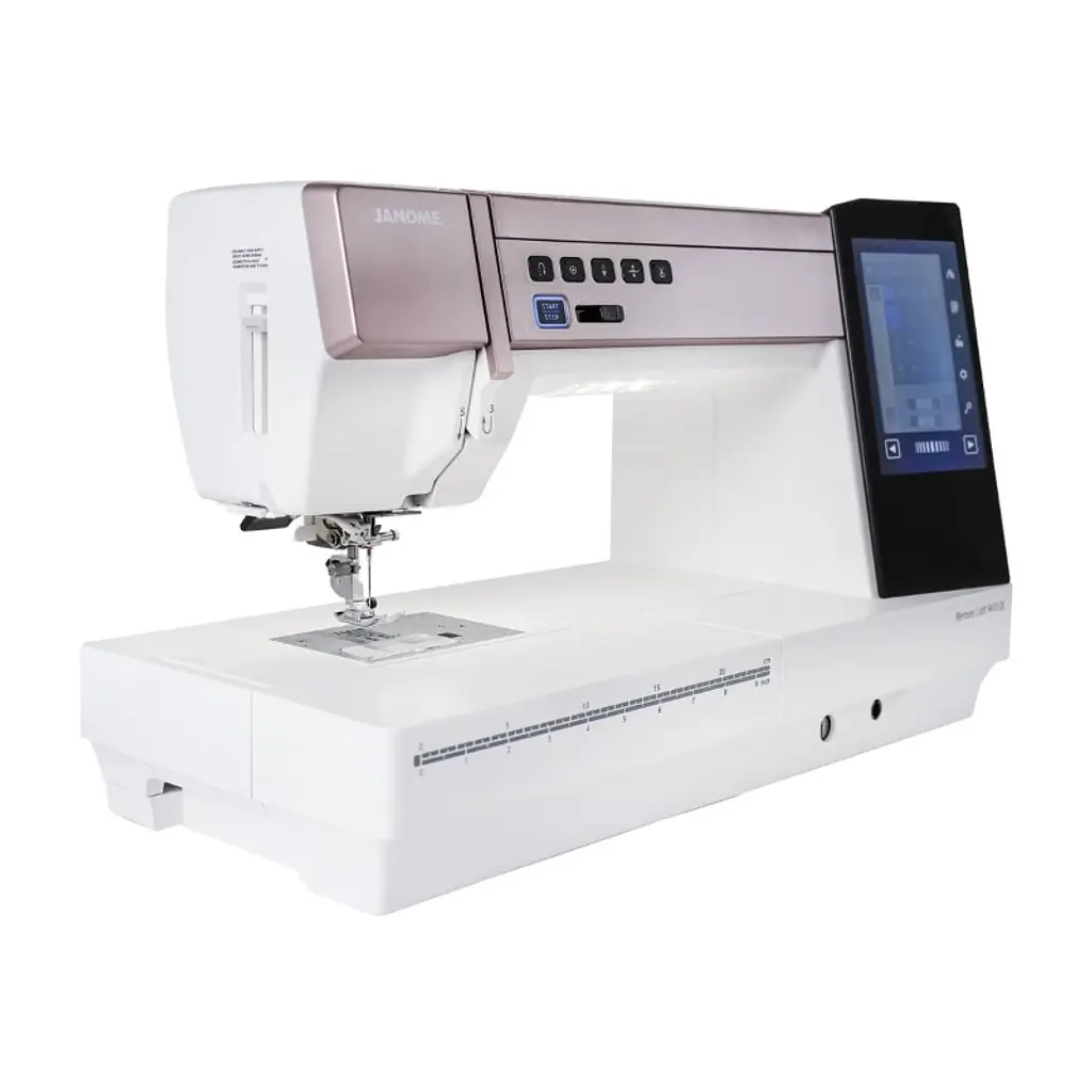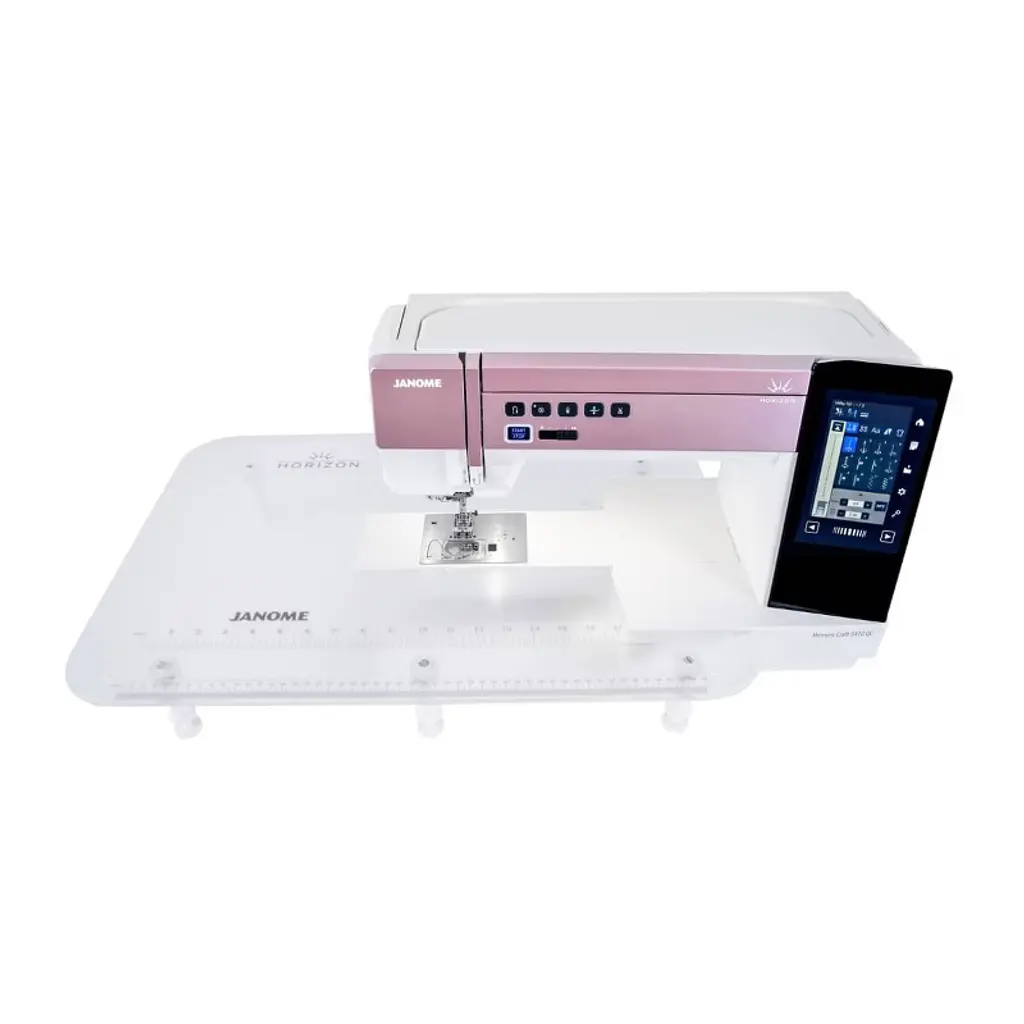 Take your sewing to new heights with the Horizon Memory Craft 9410 QC Hi-Definition Quilting is achieved with the Janome exclusive Detachable AcuFeed Flex Layered Fabric Feeding System as an optional accessory. Automatic presser foot lift, variable zig zag for free motion quilting, and includes a Ruler work foot. Experience Hi-Definition Sewing with 300 built-in stitches, 11 one-step buttonholes, and alphanumeric fonts, including 9mm lettering and numbers. Precision stitching is achieved with the included straight stitch needle plate and 7-piece feed dog. Customize each stitch, including buttonholes, plus save your favorite stitches easily using the 5-inch High-Def Color Screen. The Horizon Memory Craft 9410QC also features an Enhanced Superior Needle Threader, and Stitch composer stitch creation software!