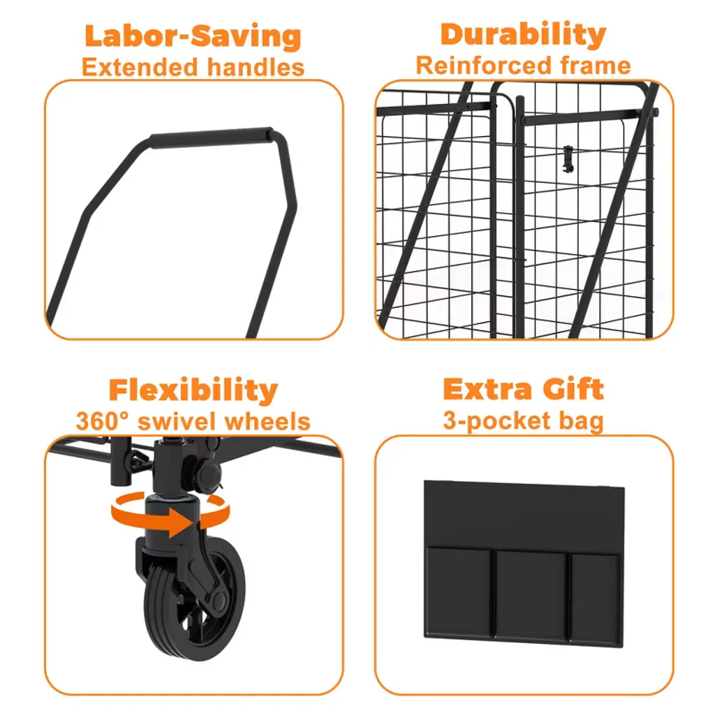 Experience effortless transportation with this extra-large folding shopping cart, designed for groceries, laundry, and everyday essentials. Built from premium carbon steel, the cart supports up to 120 lbs while remaining lightweight at only 12.5 lbs. Its tear-resistant soft handle provides a comfortable grip, while the rust-proof frame and waterproof liner keep your items protected from moisture. The 7.5” rear wheels and 360° swivel front wheels ensure smooth, stable movement across any surface. With its collapsible design, it folds down to just over 9 inches for compact storage, making it the perfect companion for home, travel, or outdoor use.