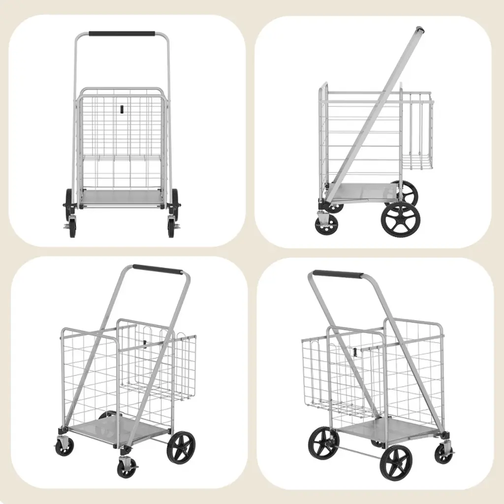 Jansno Gray Foldable Large Utility Shopping Cart With Brake, Double Basket, 360° Swivel Wheels For Groceries & Laundry