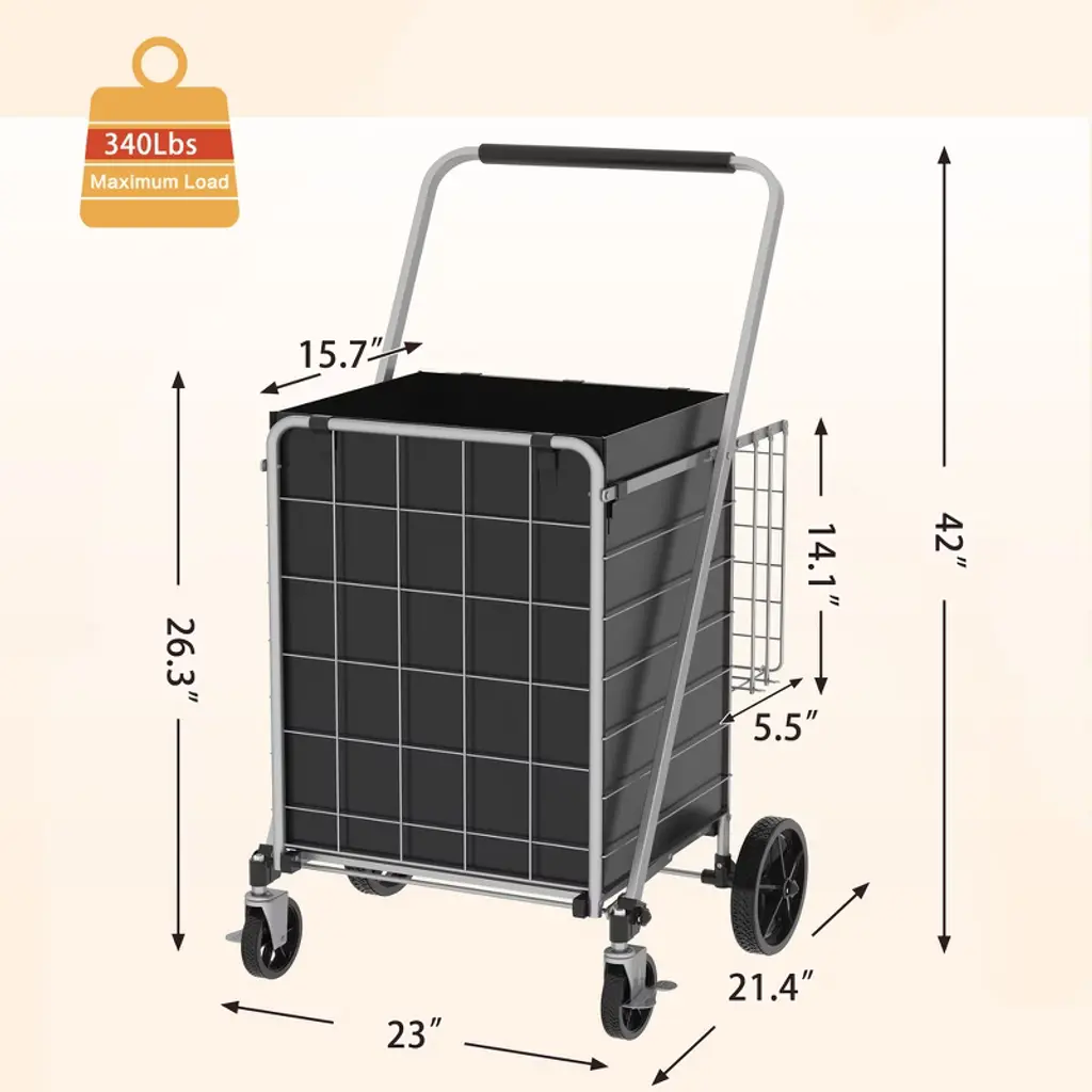 Experience unmatched convenience and durability with this heavy-duty foldable shopping cart, designed to carry up to 330 lbs with ease. Constructed from premium low-carbon stainless steel, its wide-frame design ensures superior stability and strength. The 41-inch high handle allows you to push comfortably without bending, while the 600D waterproof Oxford liner keeps your groceries protected and secure. Featuring reinforced mesh bottom bars and upgraded rubber wheels for smooth, quiet rolling on all surfaces, this cart glides effortlessly through tight spaces. Easy to assemble and fold flat for compact storage, it’s the perfect solution for groceries, laundry, or everyday hauling needs.