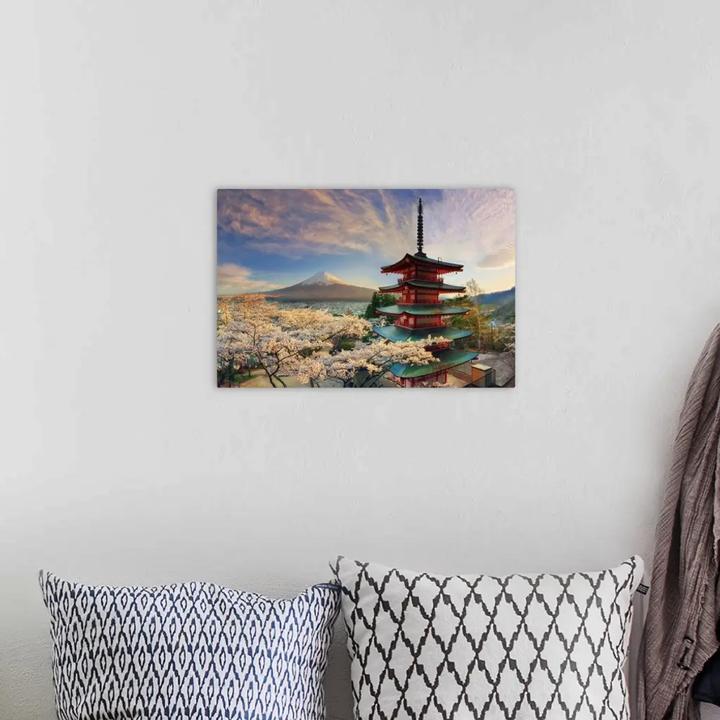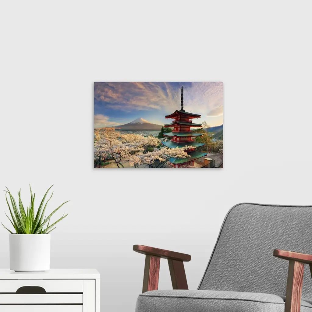 Japan, Yamanashi Prefecture, Fuji-Yoshida, Chureito Pagoda, Mt Fuji and Cherry Blossoms.