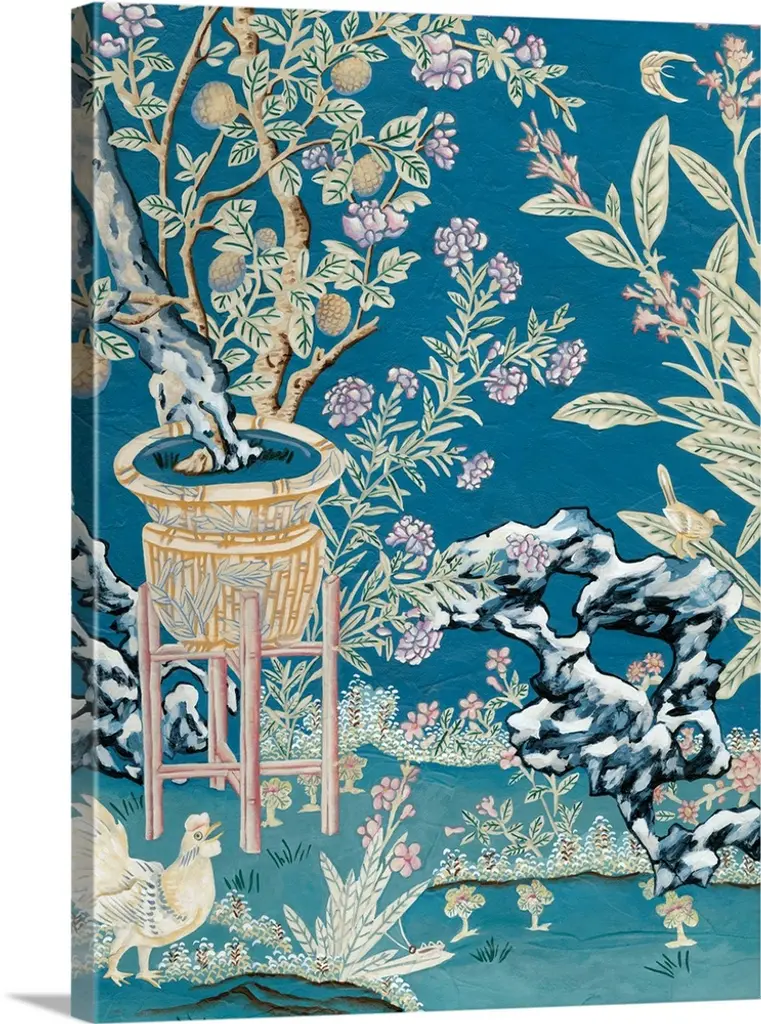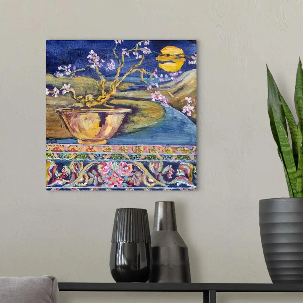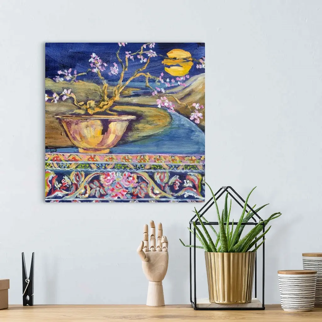 Japanese inspired landscape with view of moon, a river with bonsai in bowl, and a Persian carpet pattern.