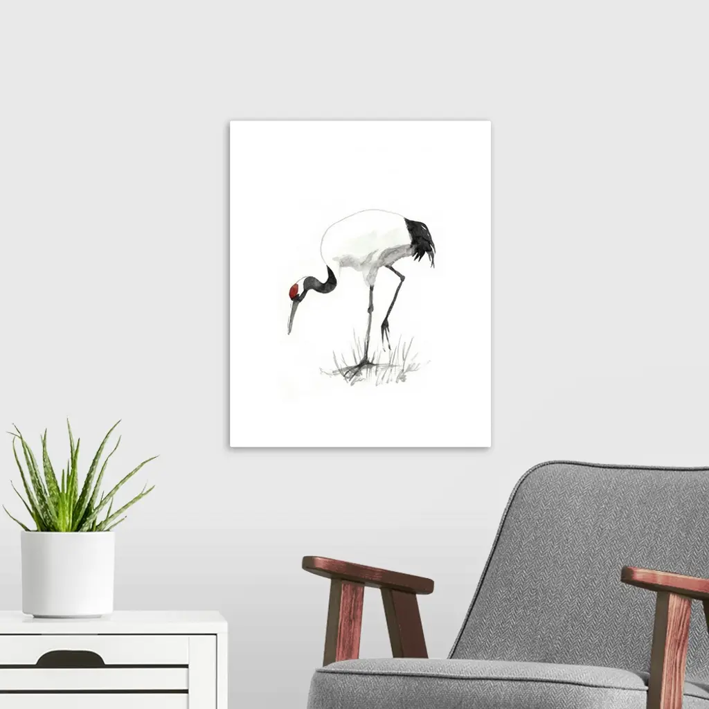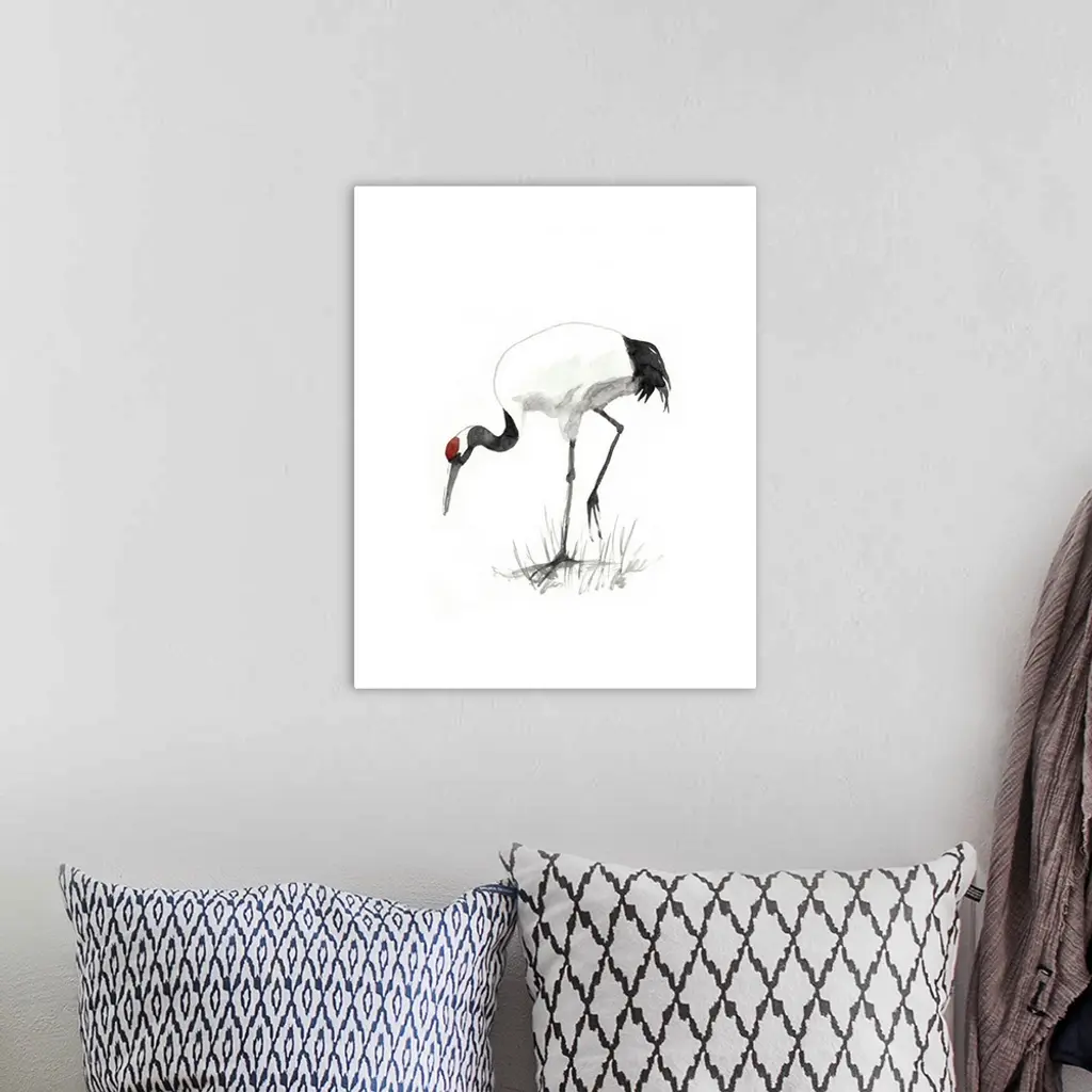 Watercolor illustration of a red-crowned crane foraging on white.