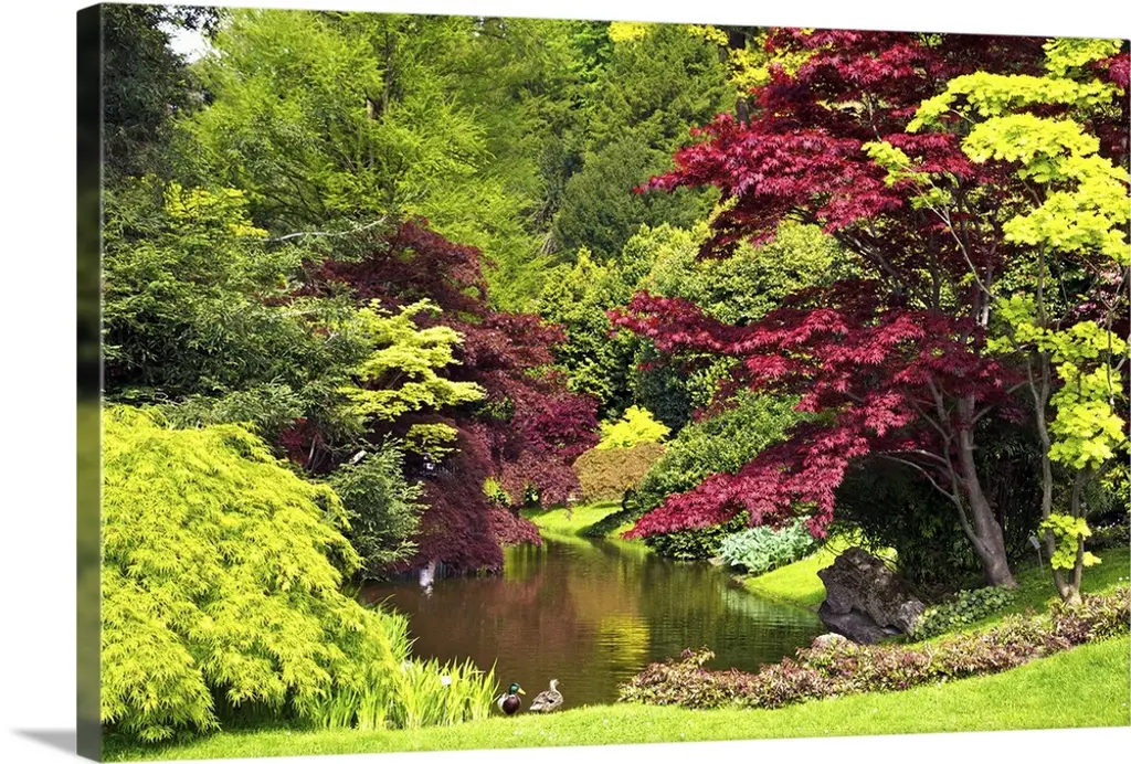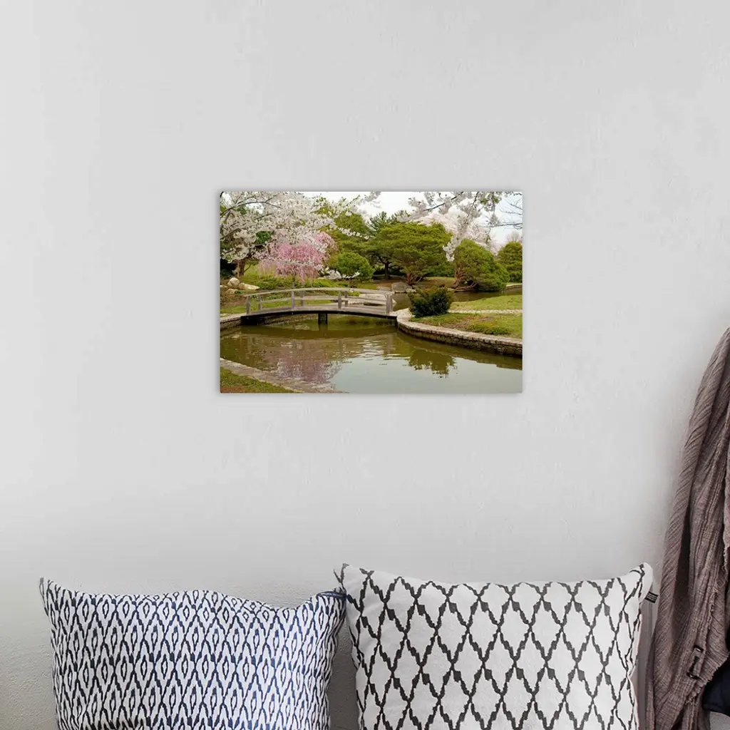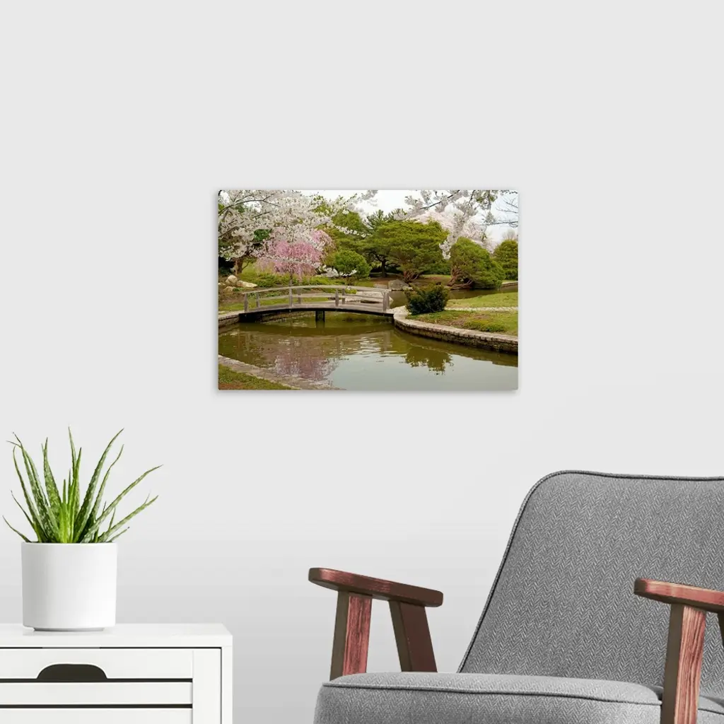 Large canvas photo art of a bridge crossing a river with flowering Japanese trees sprinkled around a garden.