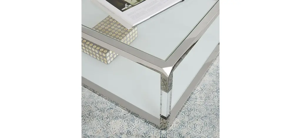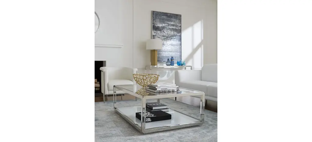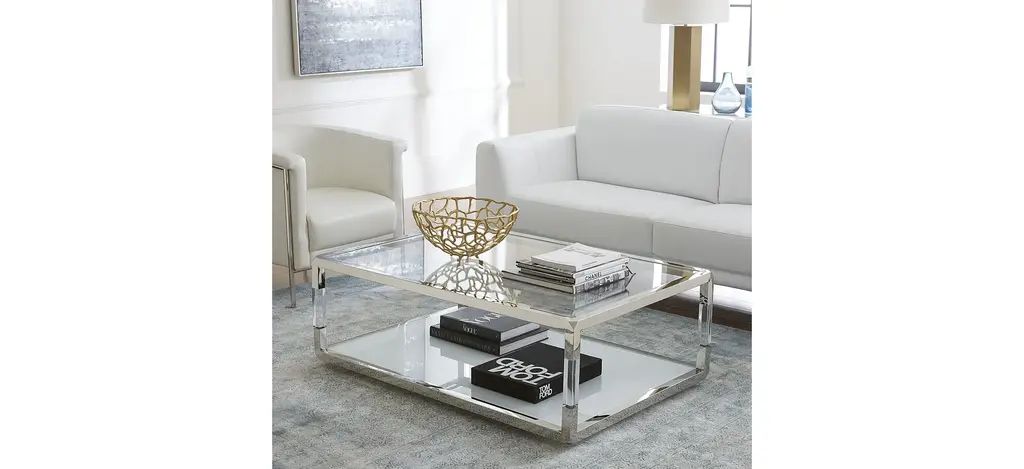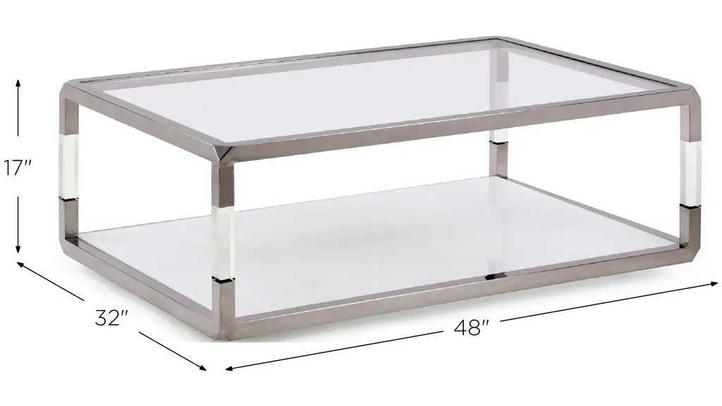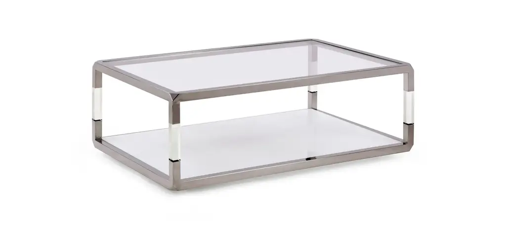 Inspired by the glamour of classically modern design, the Jasper Coffee Table offers a striking surface for display. Its ultra-clear glass top is framed in polished stainless steel and acrylic for an airy, floating look sure to impress your guests. Its bottom shelf is made from milky white glass for artful contrast.