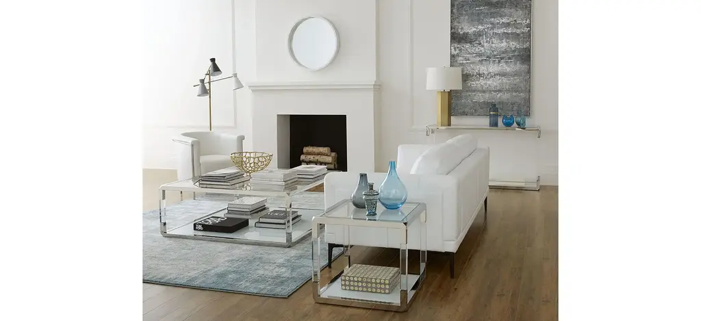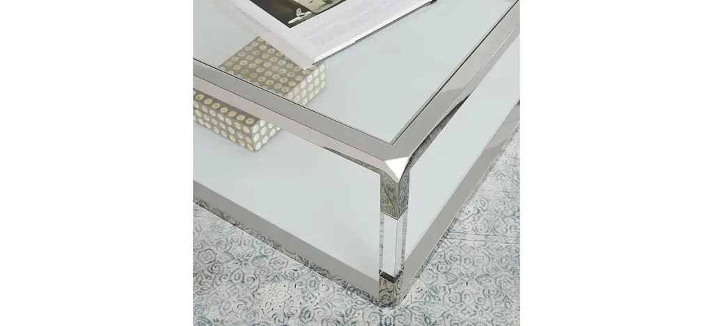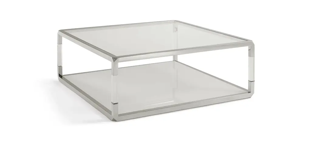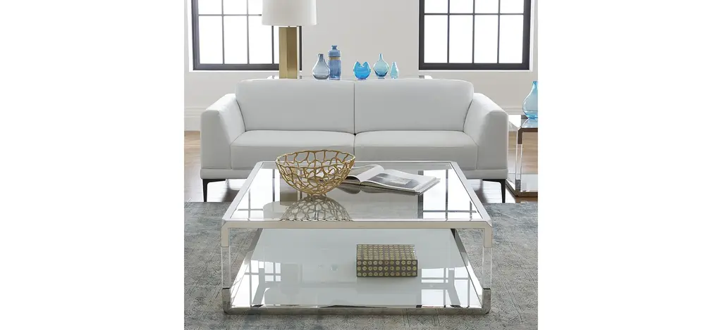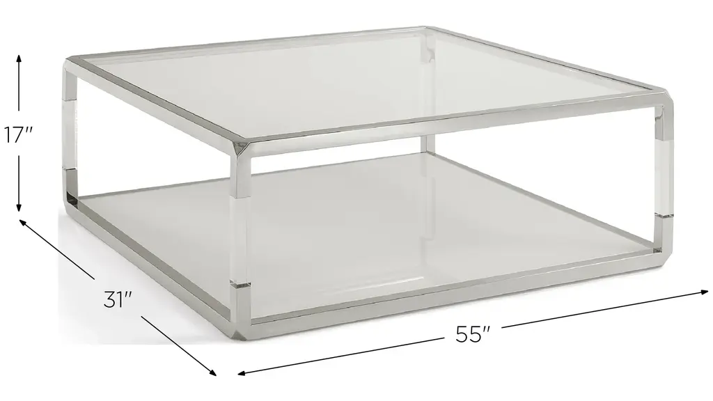Inspired by the glamour of classically modern design, the Jasper Square Coffee Table offers a striking surface for display. Its ultra-clear glass top is framed in polished stainless steel and acrylic for an airy, floating look sure to impress your guests. Its bottom shelf is made from milky white glass for artful contrast.