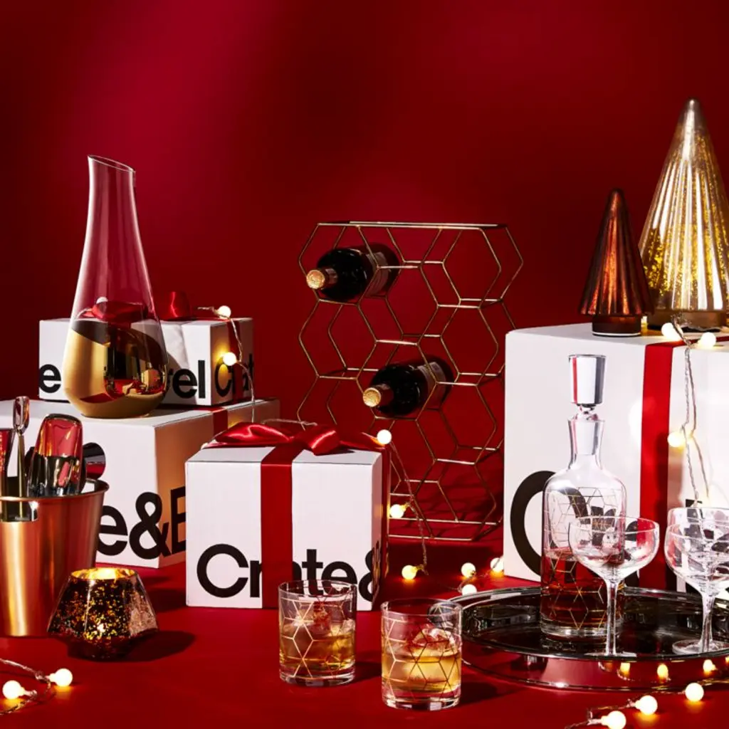 Fine-lined gold hexagons pattern this handcrafted glass decanter with sophisticated, Art Deco-inspired style. Fill this subtly gilded decanter, a Crate and Barrel exclusive, with your favorite liquor or liqueur. For a coordinated cocktail hour, pair with our Jaxson rocks glasses. Due to its handcrafted nature, each decanter will be slightly different.