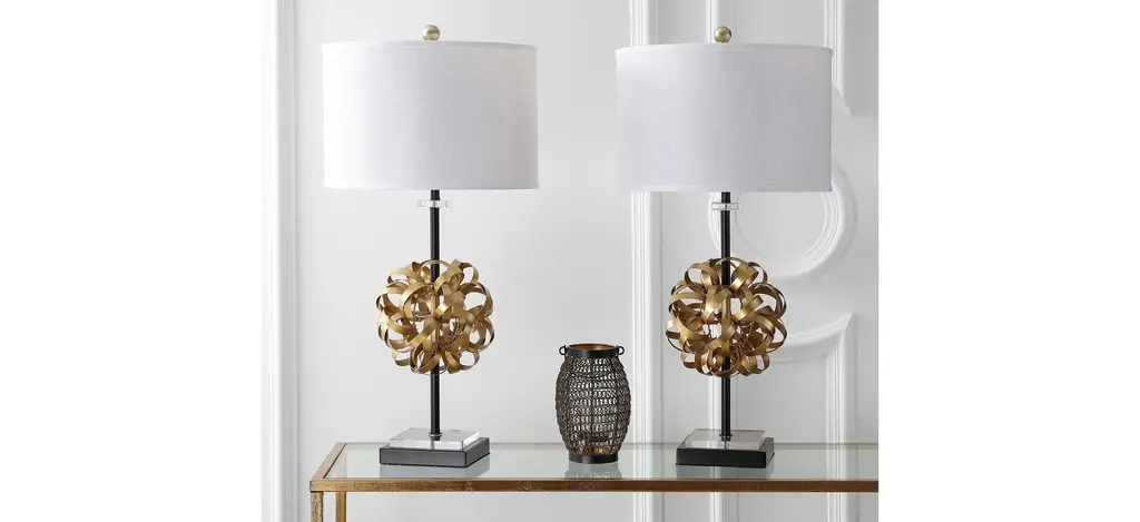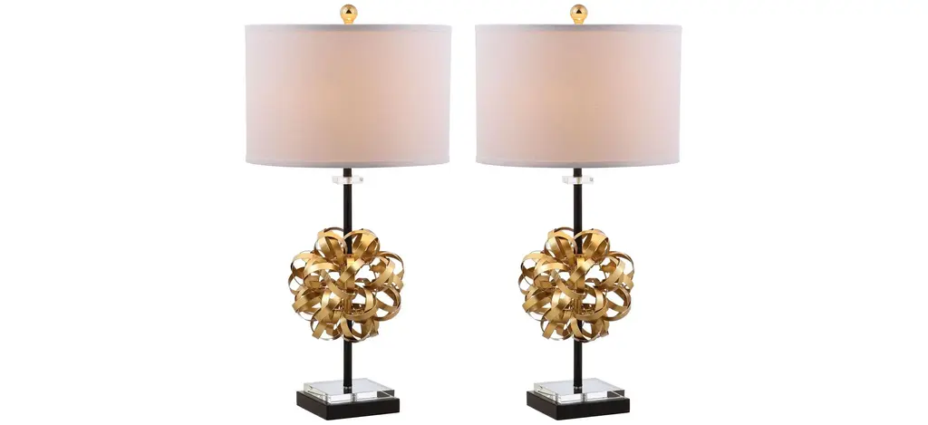 Bring luxe style to any interior with this sleek Jaxton Table Lamp Set. Artfully designed, its whimsical, gold sculpture and smooth crystal base add deluxe contemporary style to the living room, entryway or hall. Sold as a set of 2.
