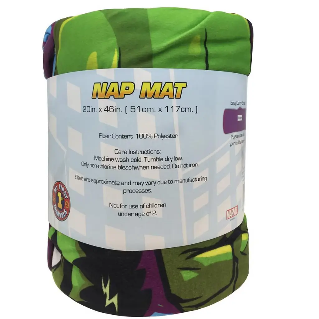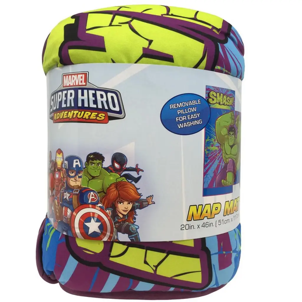 Make naptime effortless with our Marvel Super Hero Adventures Nap Mat, perfect for kids ages 3-5. This all-in-one sleeping mat features a soft built-in blanket (34 x 35 inches) and a cushioned, removable pillow (9.5 x 20 inches) for the ultimate comfort. With its cozy design and convenient removable pillow, its perfect for naps, sleepovers, and travel. Adorned with vibrant Marvel Super Hero Adventures characters like The Hulk, it makes quiet time more fun while keeping your child cozy. Designed for convenience, this nap mat features a Velcro closure and carry handle, making it perfect for daycare, preschool, or travel. Designed with safety in mind, this nap mat has no zipper and includes a removable pillow insert. Plus, it's easy to cleansimply toss it in the washing machine! Customize your child's sleep mat by writing their name on the name plaque with a waterproof marker and say goodbye to nap time mix-ups! For indoor use only, this Marvel Super Hero Adventures sleeping bag can be used on a bed, on the floor or on a small cot. Crafted from durable 100% polyester, this Marvel Super Hero Adventures nap mat is a perfect gift for birthdays, holidays, or any occasion!