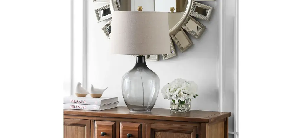 Taking inspiration from ancient pottery, this Jayce Table Lamp shines in any d_cor. Jayce's sculptural silhouette is beautifully showcased in its ombre grey glass, casting a captivating, artistic glow when struck by the light beneath its classic drum shade.