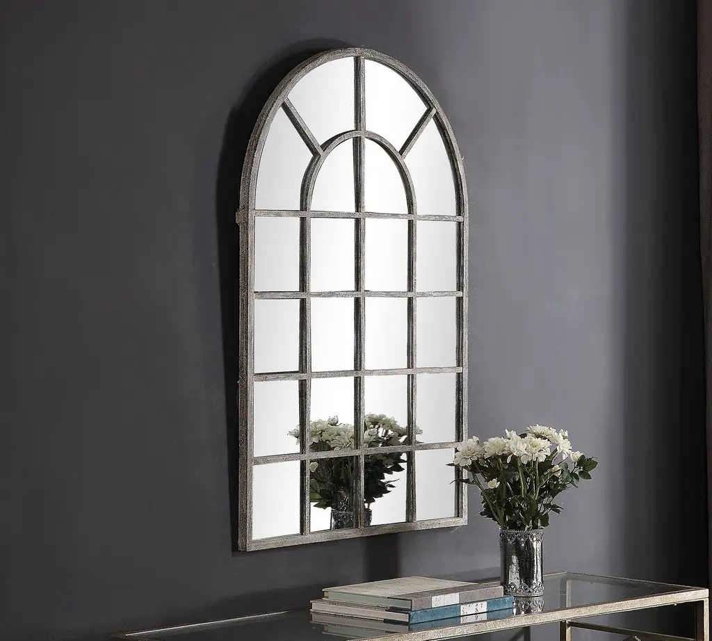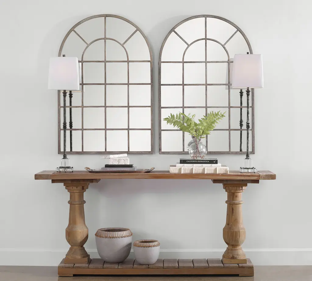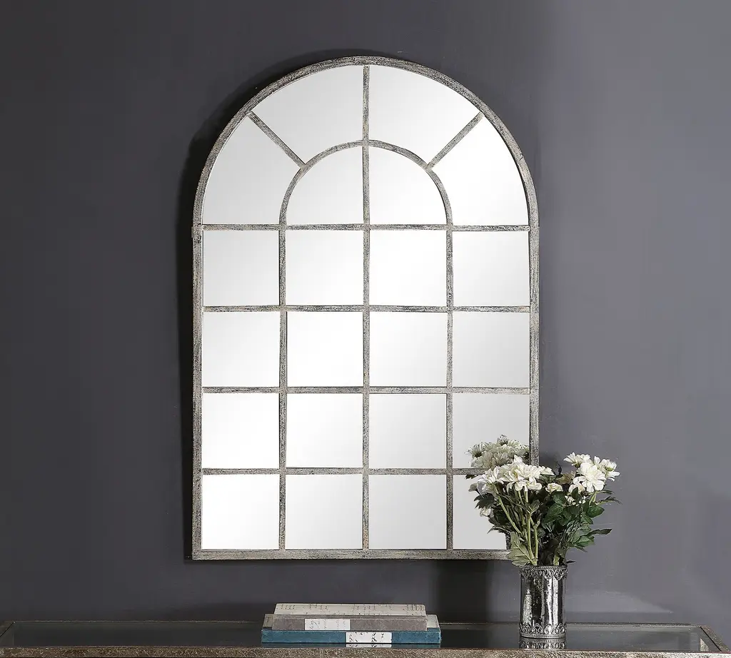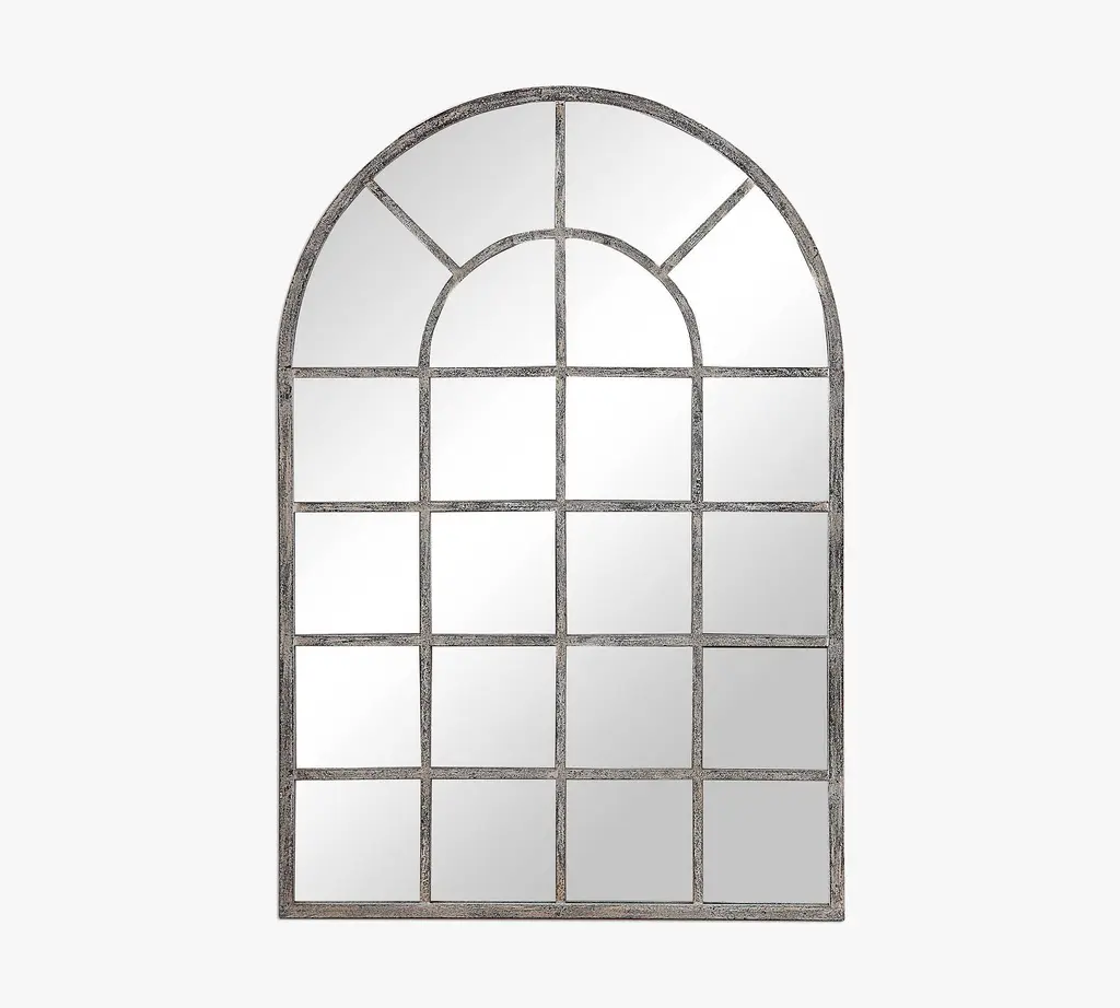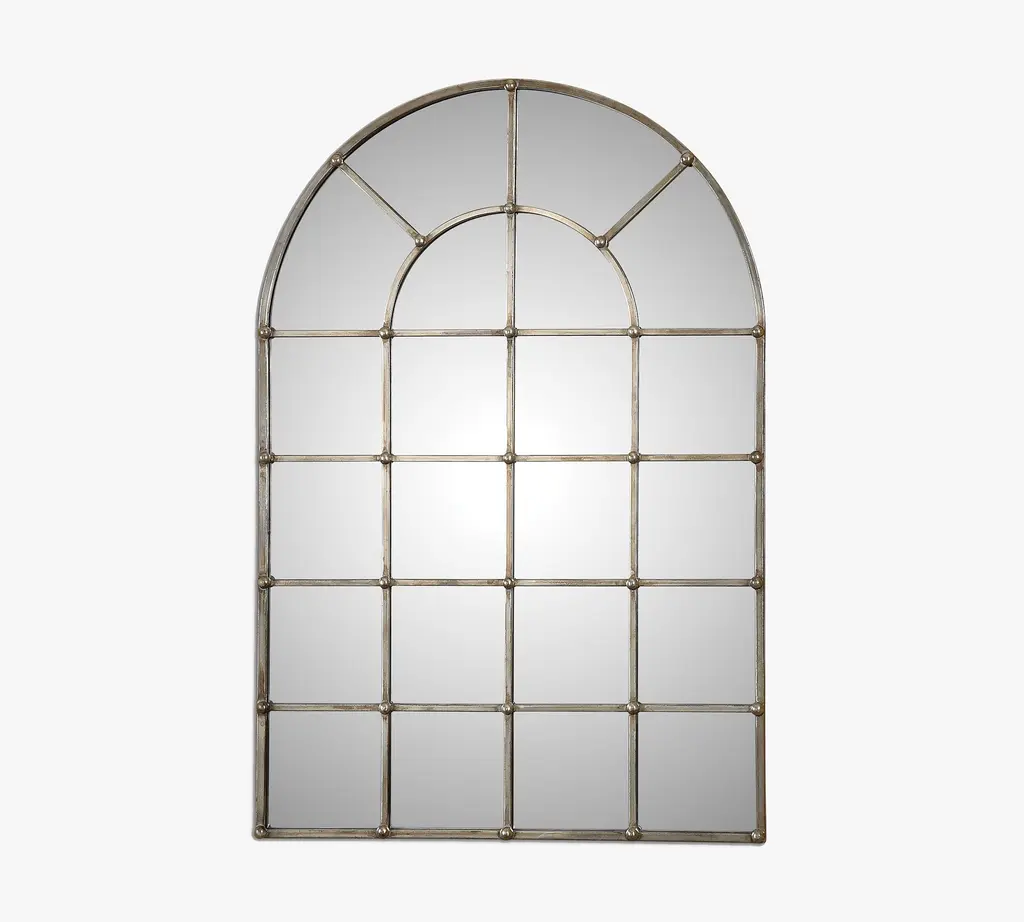 Our take on a classic Palladian-style window fills your space with light. The frame has the well-worn feel of an antique and is crafted of iron with an oxidized finish. Textured medallions accent each intersecting corner and recall the look of mullion panes.