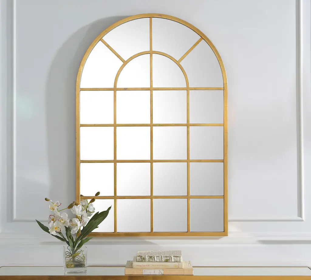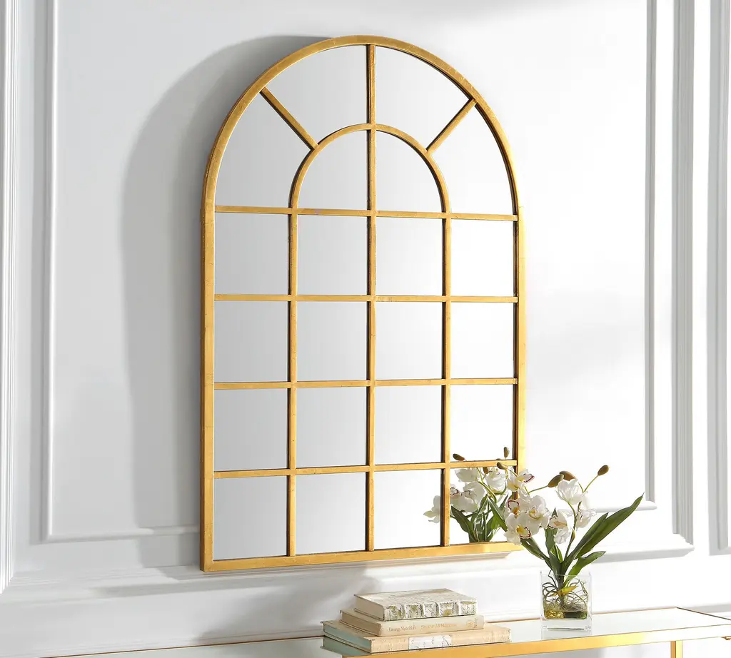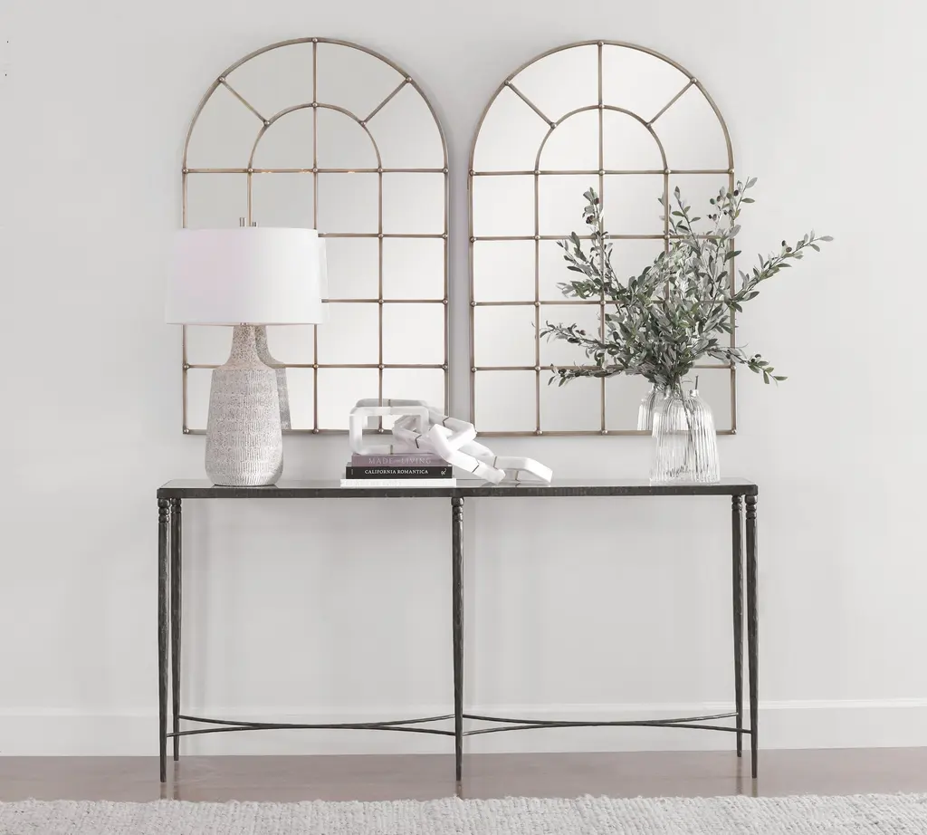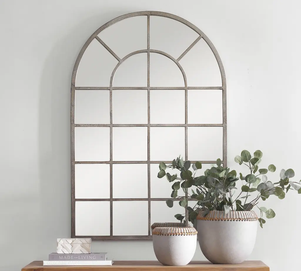 Our take on a classic Palladian-style window fills your space with light. The frame has the well-worn feel of an antique and is crafted of iron with an oxidized finish. Textured medallions accent each intersecting corner and recall the look of mullion panes.