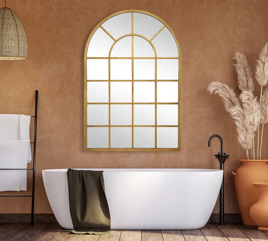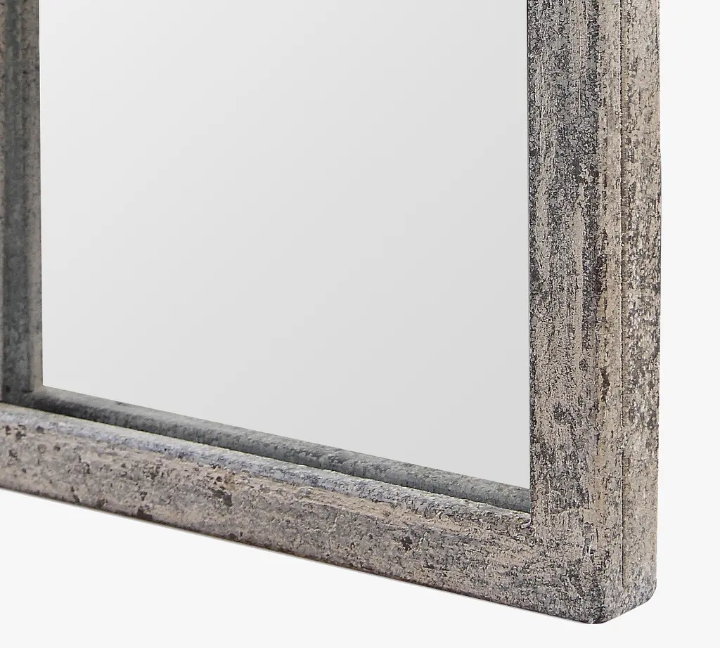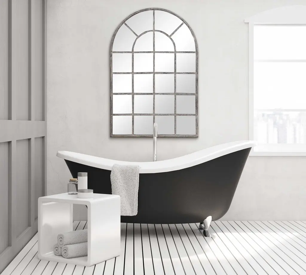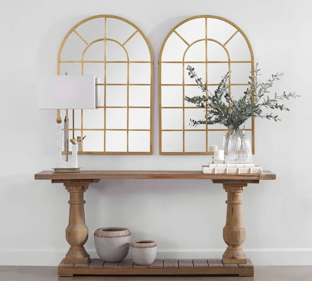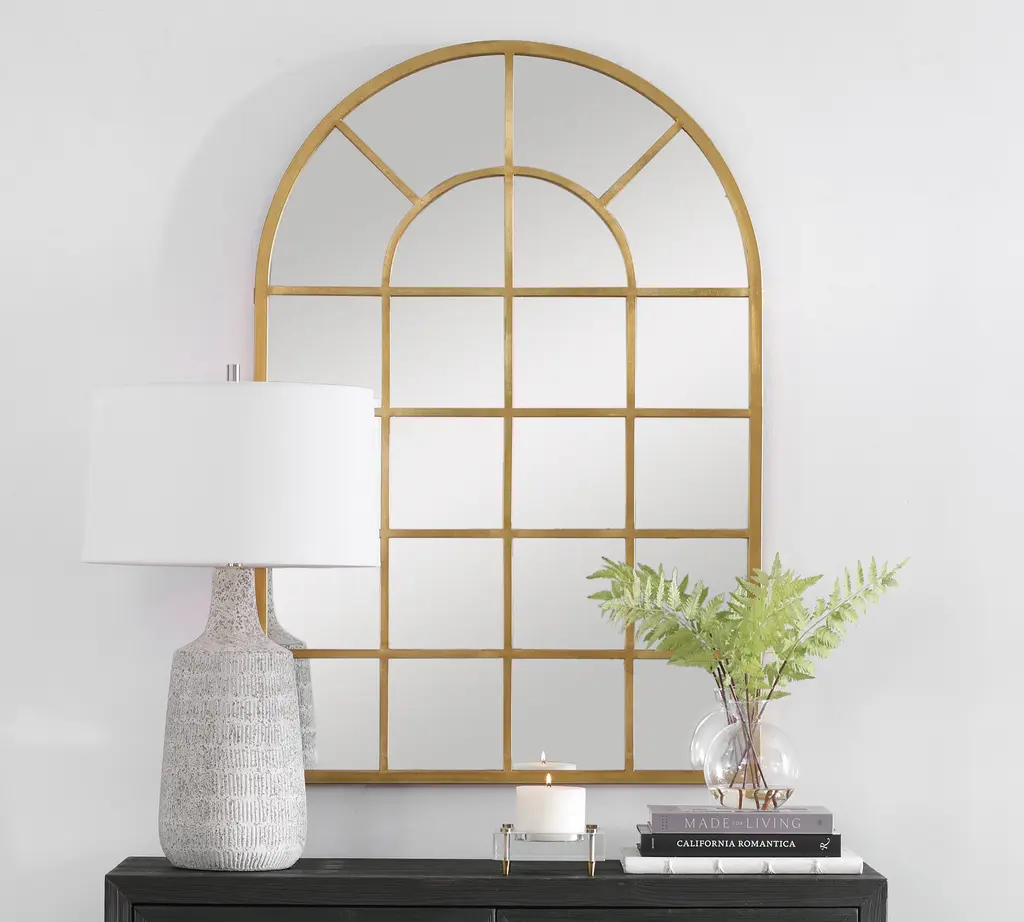 Our take on a classic Palladian-style window fills your space with light. The frame has the well-worn feel of an antique and is crafted of iron with an oxidized finish. Textured medallions accent each intersecting corner and recall the look of mullion panes.