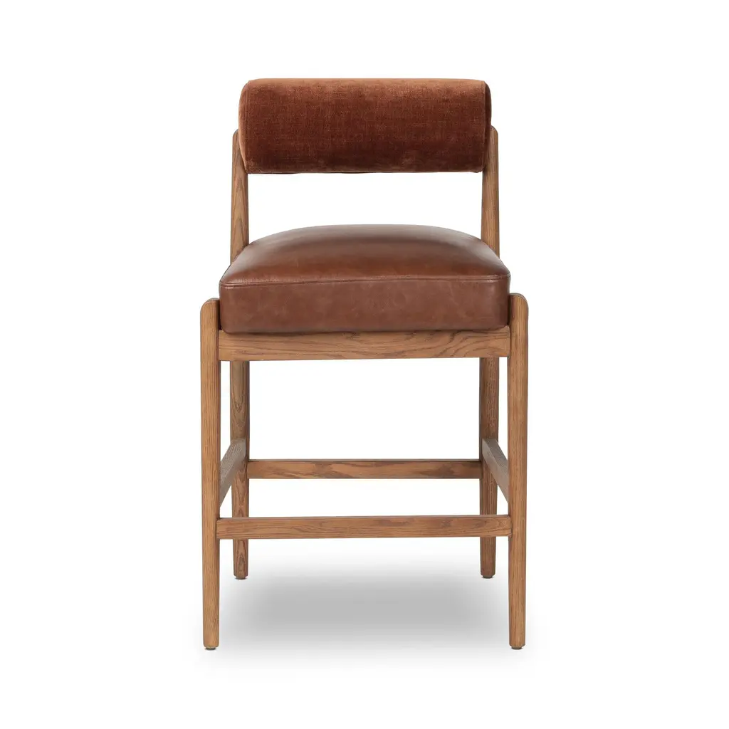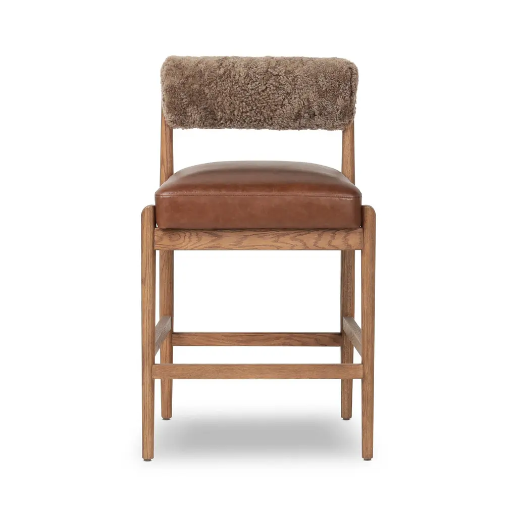 Elevate your counter seating with the Jazelle Counter Stool from Four Hands. Combining solid oak, top-grain leather, and soft shearling, this piece effortlessly blends mid-century and 70s style. Enjoy a playful update while indulging in the luxurious mix of materials. Highlights