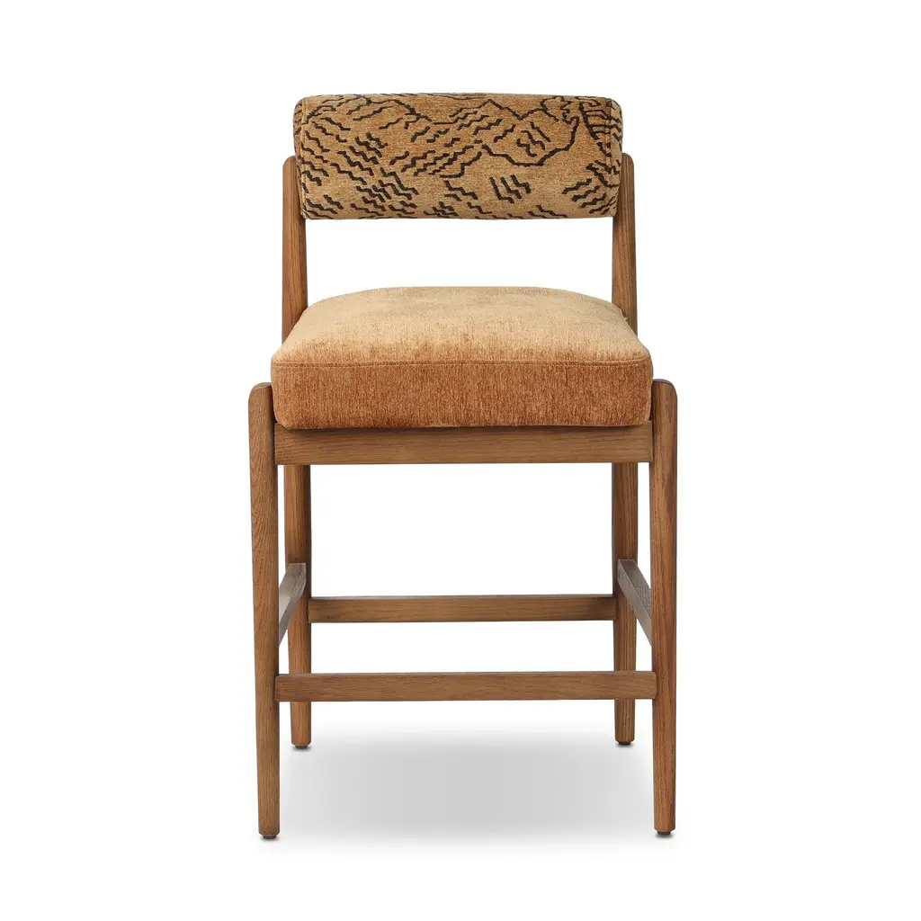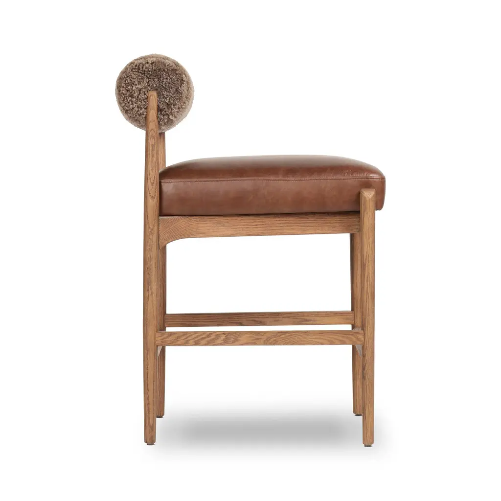 Elevate your counter seating with the Jazelle Counter Stool from Four Hands. Combining solid oak, top-grain leather, and soft shearling, this piece effortlessly blends mid-century and 70s style. Enjoy a playful update while indulging in the luxurious mix of materials. Highlights