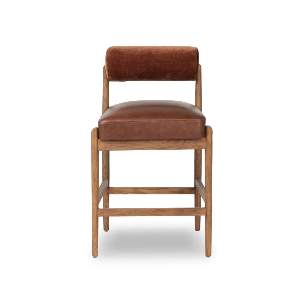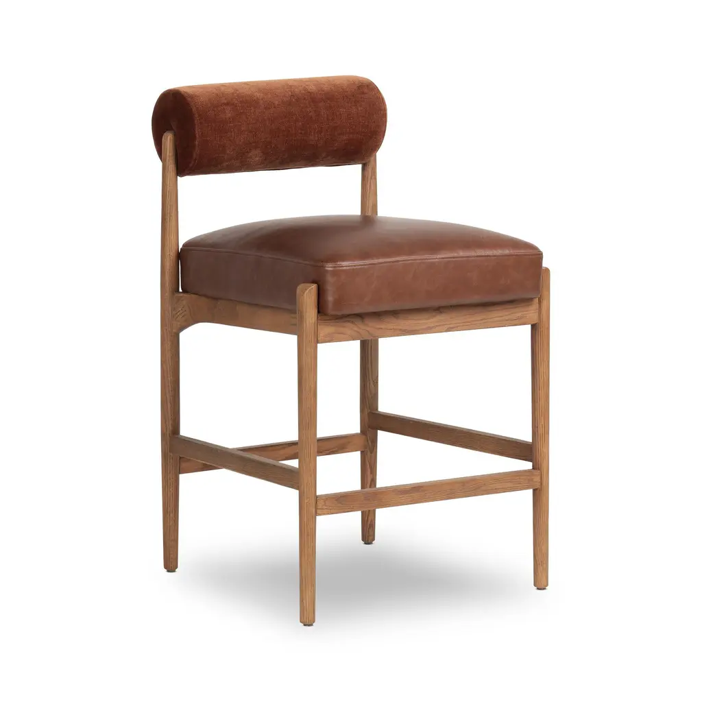 Elevate your counter seating with the Jazelle Counter Stool from Four Hands. Combining solid oak, top-grain leather, and soft shearling, this piece effortlessly blends mid-century and 70s style. Enjoy a playful update while indulging in the luxurious mix of materials. Highlights