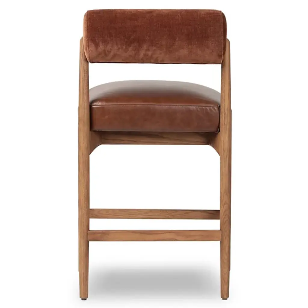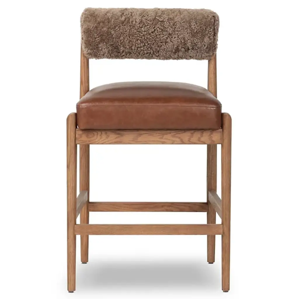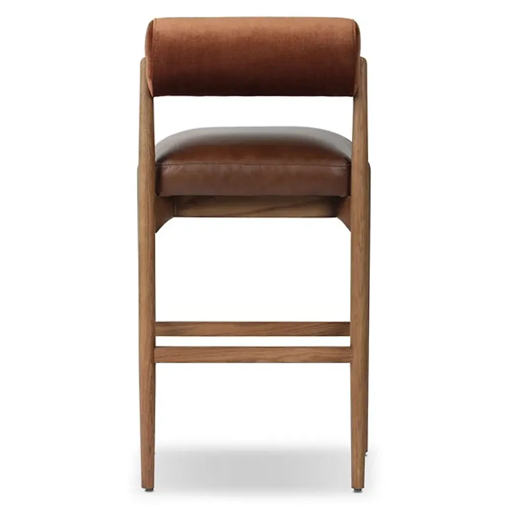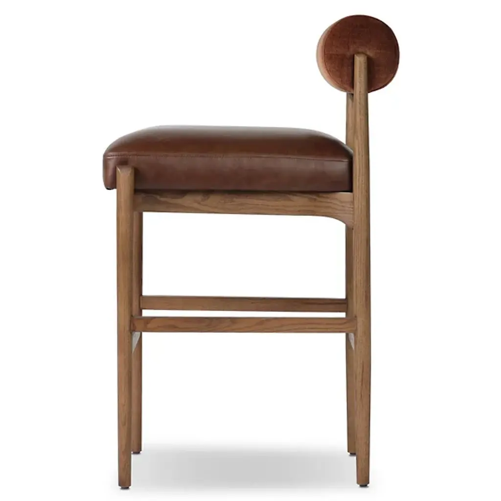 The Jazelle Bar / Counter Stool from Four Hands offers a fresh update to the classic counter stool design with its bold, bolstered cylindrical seat back. Upholstered in rich top-grain leather, it creates both comfort and style, while a warm-finished oak frame with four legs and ample cross-bracing adds natural character. Great for islands, bars, or elevated dining spaces, this contemporary design adds a playful, contrasting aesthetic that adds strength and style to any seating arrangement.