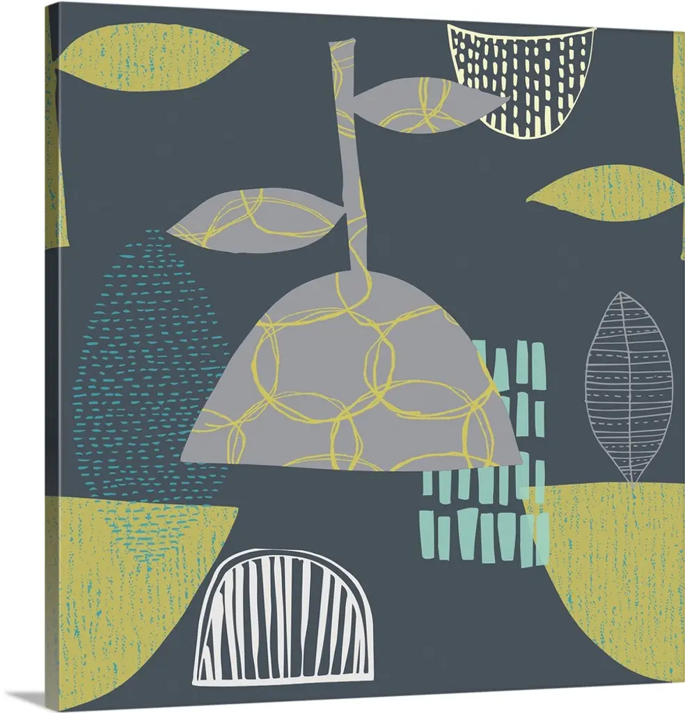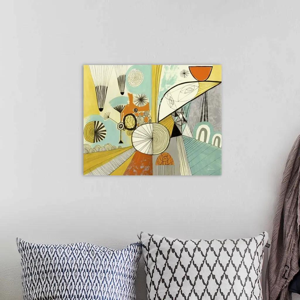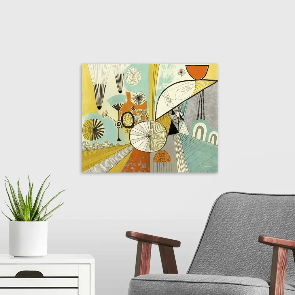 Contemporary illustration with a retro feel of colorful shapes and designs.