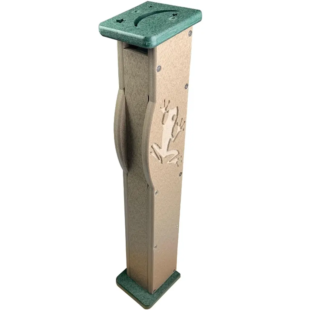 Designed to attract tree frogs by providing a moist secure resting locationTree frogs will emerge from the house right before dark and return to rest in the house during the daytimeMade of poly lumber material that will never crack, split or fadeThis JCs Wildlife Tree Frog House is a perfect place for your chirpy neighbors to call home. Nearly 30 species of tree frogs live in the United States and Southern Canada. This Tree Frog House is designed to attract tree frogs by providing a secure resting location. Hang this house 4-6 feet on the side of a post, tree, or building. Place the house near an outdoor light source for best results. Tree frogs will typically emerge from the house right before dark and rest in the house during daytime. Several frogs may use the house at the same time. The Tree Frog House is made of recycled poly lumber material and will never crack, split or fade! Overall Dimensions: 20" H x 3.5" W x 3.5" D