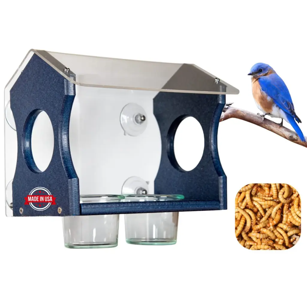 ENVIRONMENTAL: Made by hand at our JCs Wildlife location using recycled poly lumber ENJOYABLE DESIGN: Fun color design that stands out among your feeders. A great place for bluebirds to perch and enjoy their treat! DIMENSIONS: 9Lx7Wx11H and approx. 1lb 11oz SIMPLE AND HASSLE FREE: Comes with 2 plastic jars for feeding. Design also allows for easy cleaning! Made in the USA Made of Poly Lumber and 1/8" Plexiglass with stainless steel screws, also comes with the 2 mealworm jars. Hanging cable is attached, and the color is a dark poly lumber blue. A great place for the Bluebirds to perch and enjoy their mealworm treat! A fun color that stands out! Dimensions: 9Lx7Wx11H and approx. 1lb 11oz