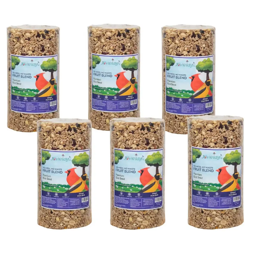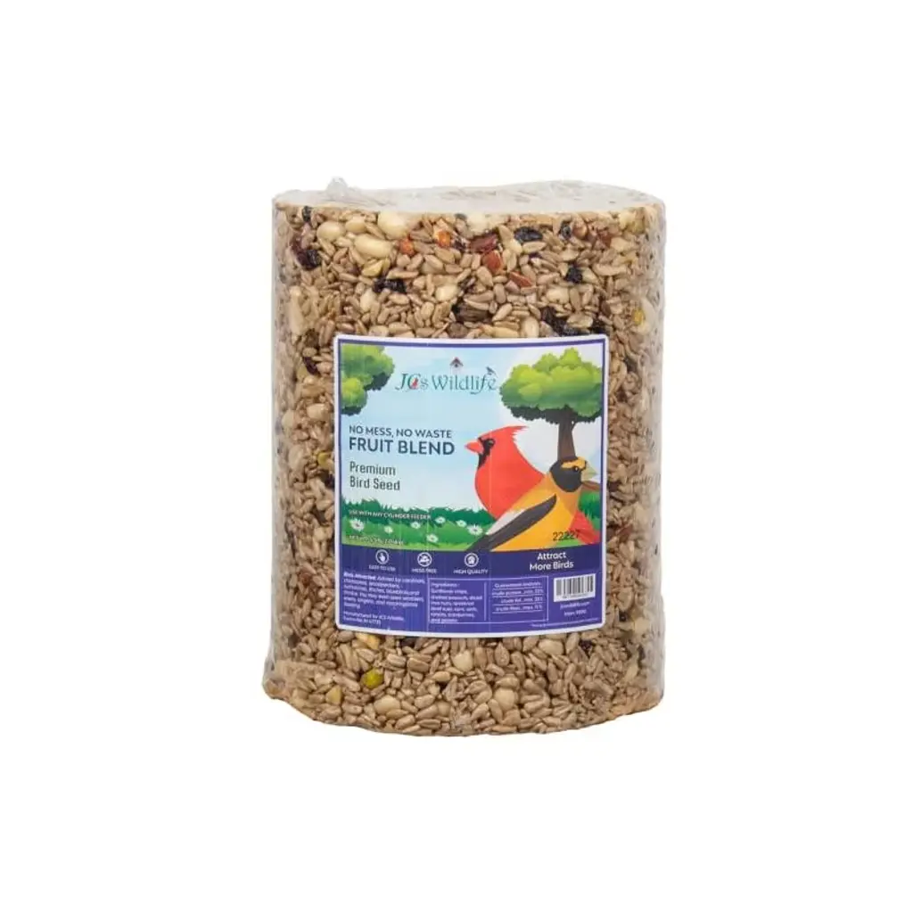 Keep your lawn beautiful and your feathered friends happy with the JCs Wildlife No Mess, No Waste Fruit Blend Premium Bird Seed Cylinder! Top quality ingredients are used throughout this cylinder made by birders for birders right here in the midwest US. No hulls. No shells and the best ingredients for a variety of birds mean that this blend feeds your backyard friends, not destroys your lawn. This easy-to-use, mess-free cylinder may be used with any cylinder feeder. Birds attracted to this blend: Cardinals, chickadees, woodpeckers, nuthatches, finches, bluebirds, and titmice. You may also notice warblers, wrens, kinglets, and mockingbirds feasting. Ingredients: Sunflower chips, shelled peanuts, diced tree nuts, rendered beef suet, corn, oats, raisins, cranberries, and gelatin Guaranteed Analysis: Crude protein- min 22% Crude fat- min 33% Crude fiber- max 11%