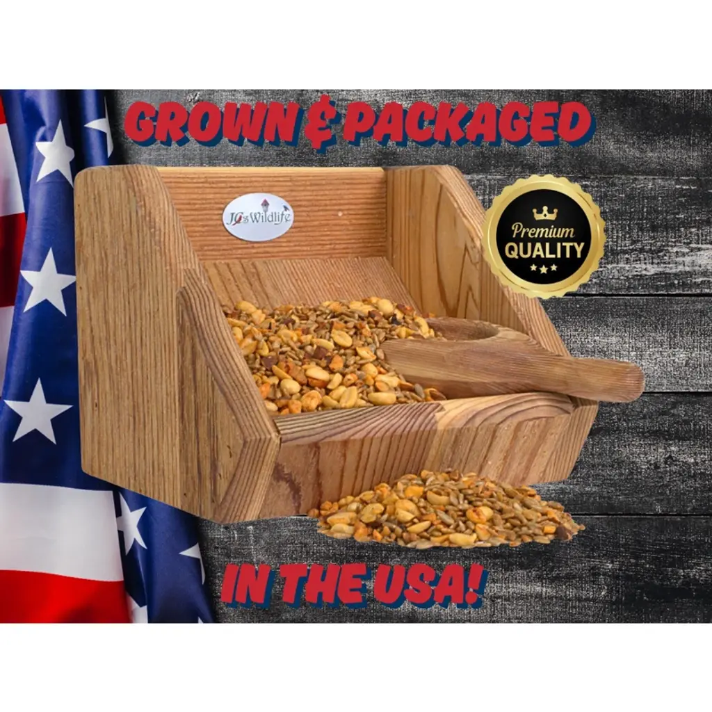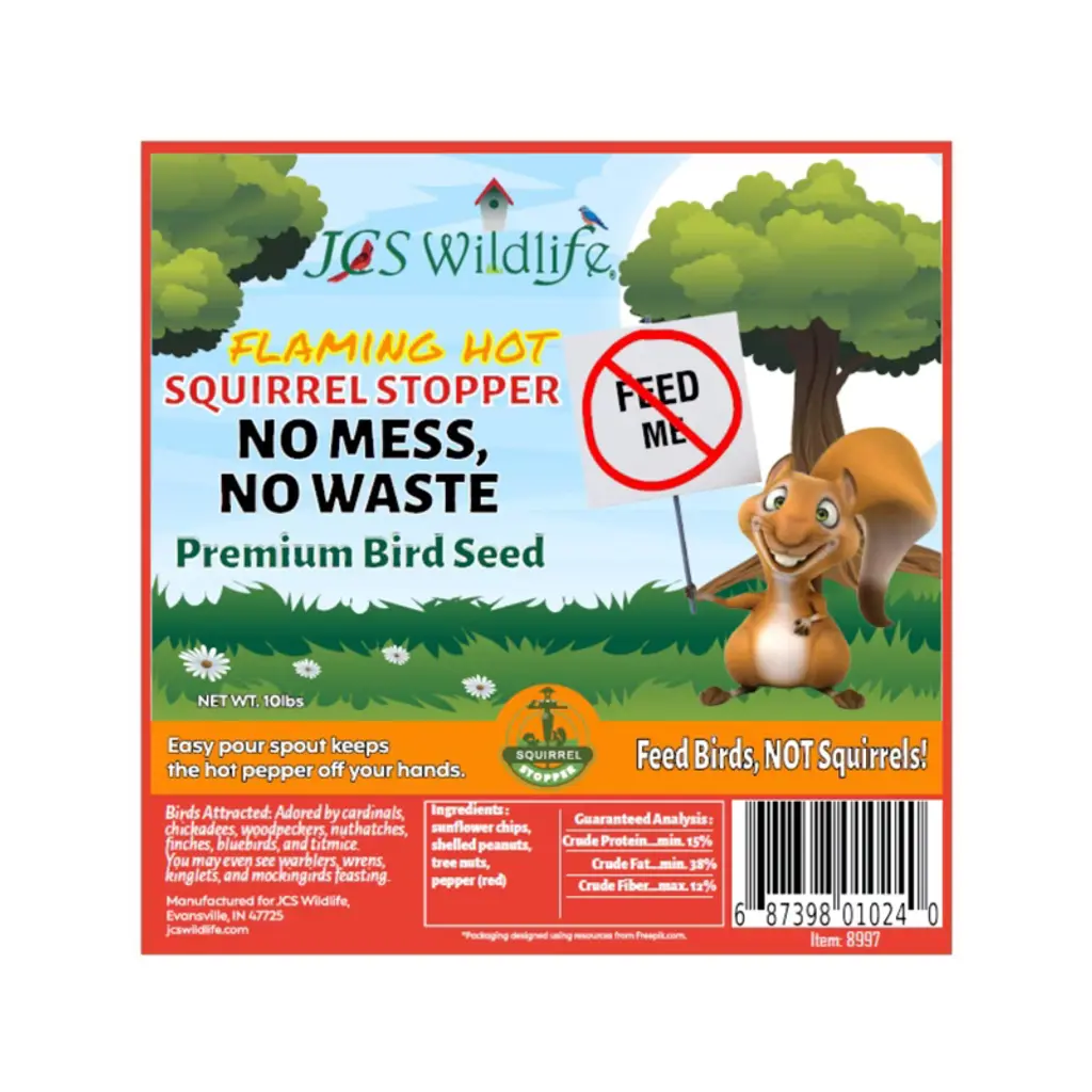 Keep your backyard birds happy while keeping pesky squirrels at bay! The JCS Wildlife Squirrel Stopper No Mess, No Waste Seed is specially formulated to attract a variety of birds while minimizing waste and mess. Packed with premium ingredients like sunflower chips, shelled peanuts, tree nuts, and capsaicin, this blend ensures high-energy nutrition for your feathered visitors. Avoid contact with eyes or other sensitive areas as irritation will occur. Each bag contains 10lbs of seed. Guaranteed Analysis: Crude Protein min. 22% Crude Fat min. 33% Crude Fiber max. 11%