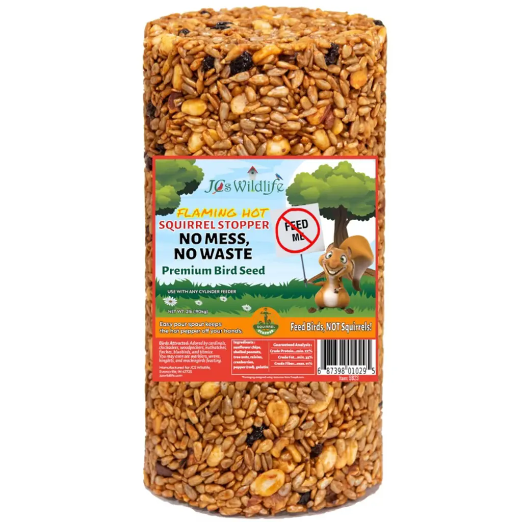 Keep your feeders feather-friendly and squirrel-free with the JCS Wildlife Squirrel Stopper No-Mess No-Waste Small Cylinder. Weighing in at 2lbs, this compact powerhouse is packed with high-energy ingredients birds love—minus the hulls, fillers, and furry freeloaders. Infused with capsaicin to naturally deter squirrels, it’s the perfect blend for clean feeding and vibrant backyard birdwatching. Ingredients Sunflower Chips Shelled Peanuts Almonds Walnuts Pistachios Cashews Rendered Beef Suet Corn Oats Raisins Cranberries Capsaicin Gelatin Guaranteed Analysis Crude Protein min. 22% Crude Fat min. 33% Crude Fiber max. 11%