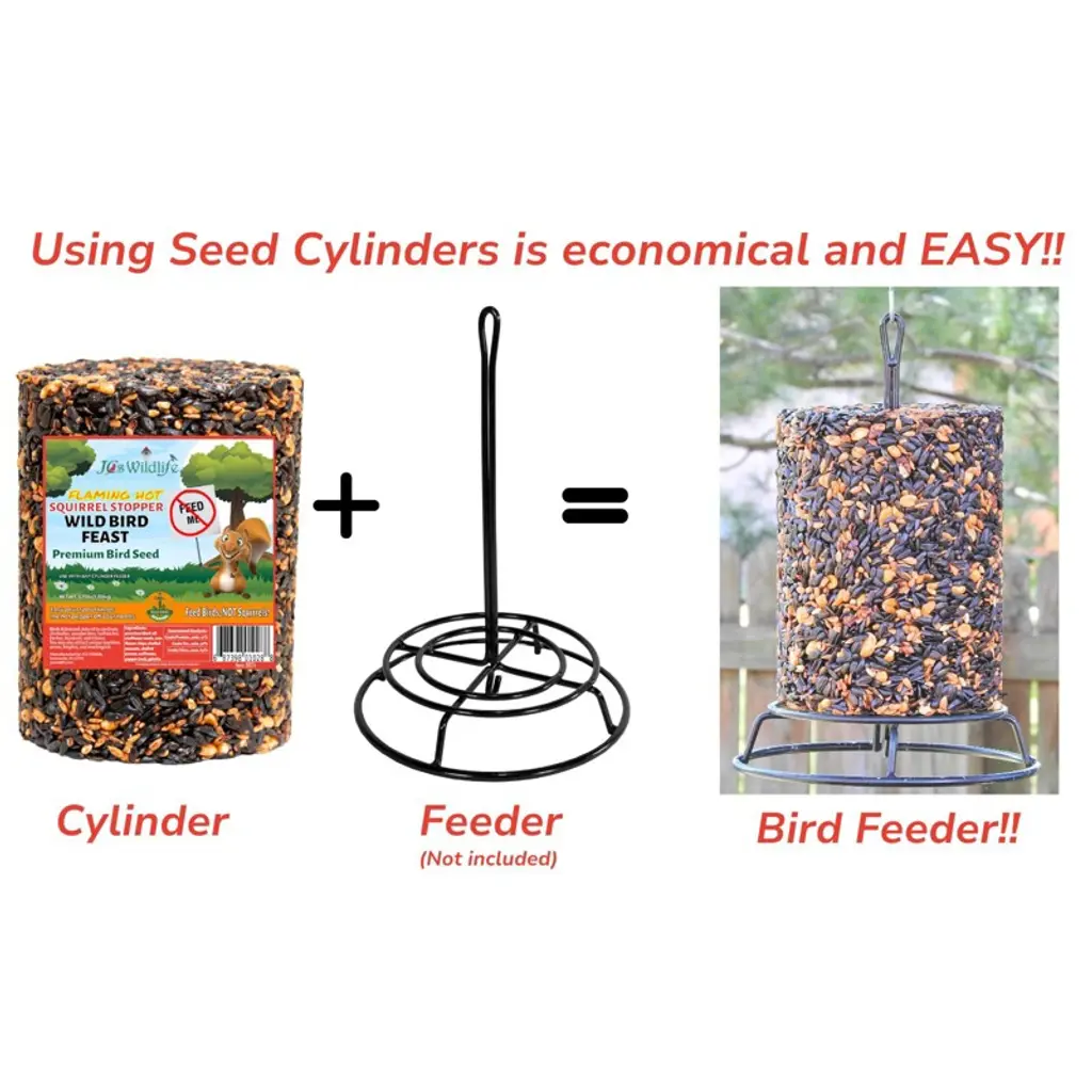 Invite a flurry of feathered friends to your yard—without the squirrel drama. The JCS Wildlife Squirrel Stopper Wild Bird Feast Large Cylinder is a 3.75lb blend of premium ingredients designed to attract colorful wild birds while keeping squirrels at bay. Packed with sunflower seeds, peanuts, pecans, safflower, and infused with capsaicin, this no-mess, no-waste cylinder delivers high-energy nutrition in a clean, feeder-friendly format. Ingredients Premium Oil Sunflower Seed Sunflower Chips Shelled Peanuts Shelled Pecans Safflower Capsaicin Gelatin Guaranteed Analysis Crude Protein min. 17% Crude Fat min. 36% Crude Fiber max. 23% Net Wt. 3.75 lbs. (1.70 Kg)