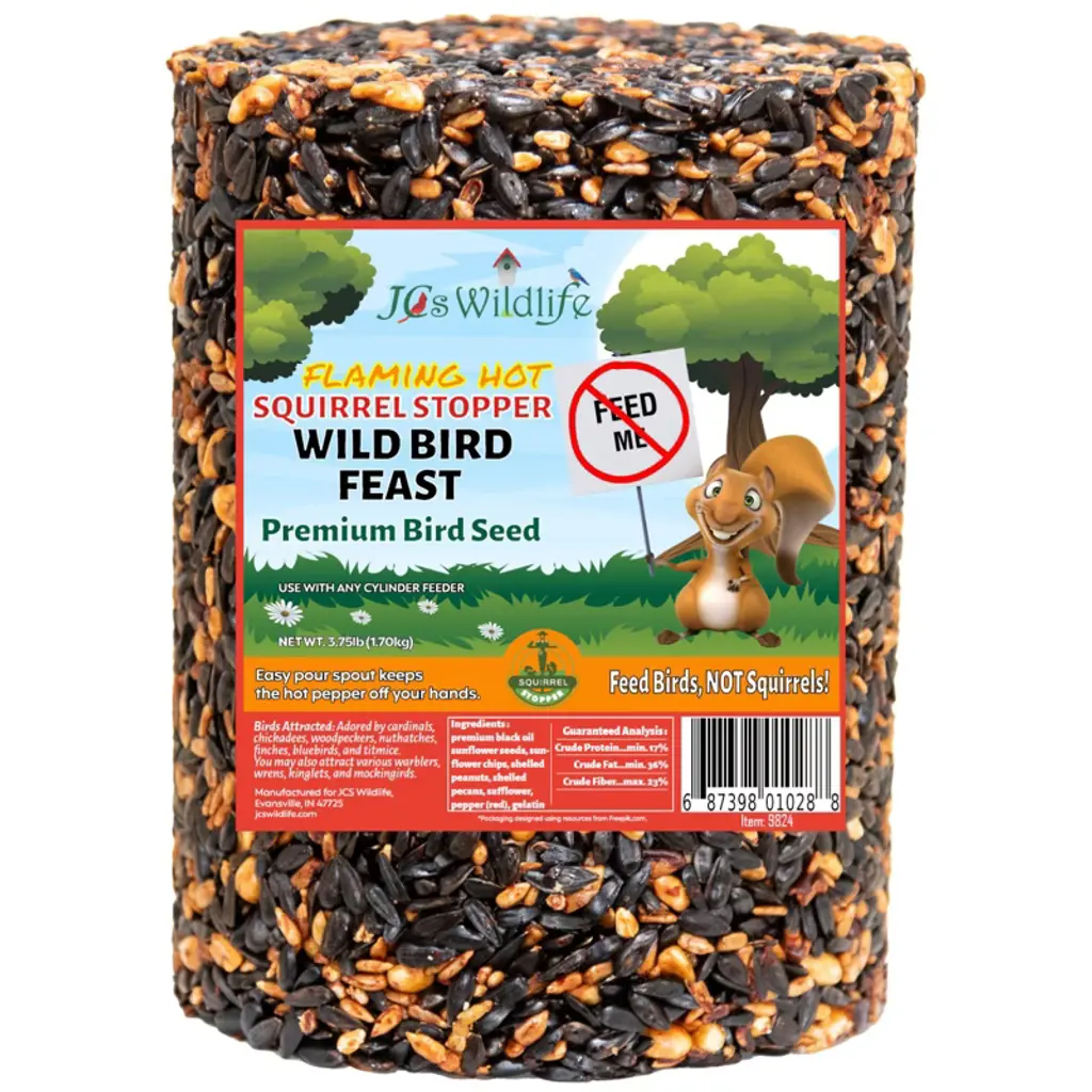 Invite a flurry of feathered friends to your yard—without the squirrel drama. The JCS Wildlife Squirrel Stopper Wild Bird Feast Large Cylinder is a 3.75lb blend of premium ingredients designed to attract colorful wild birds while keeping squirrels at bay. Packed with sunflower seeds, peanuts, pecans, safflower, and infused with capsaicin, this no-mess, no-waste cylinder delivers high-energy nutrition in a clean, feeder-friendly format. Ingredients Premium Oil Sunflower Seed Sunflower Chips Shelled Peanuts Shelled Pecans Safflower Capsaicin Gelatin Guaranteed Analysis Crude Protein min. 17% Crude Fat min. 36% Crude Fiber max. 23% Net Wt. 3.75 lbs. (1.70 Kg)
