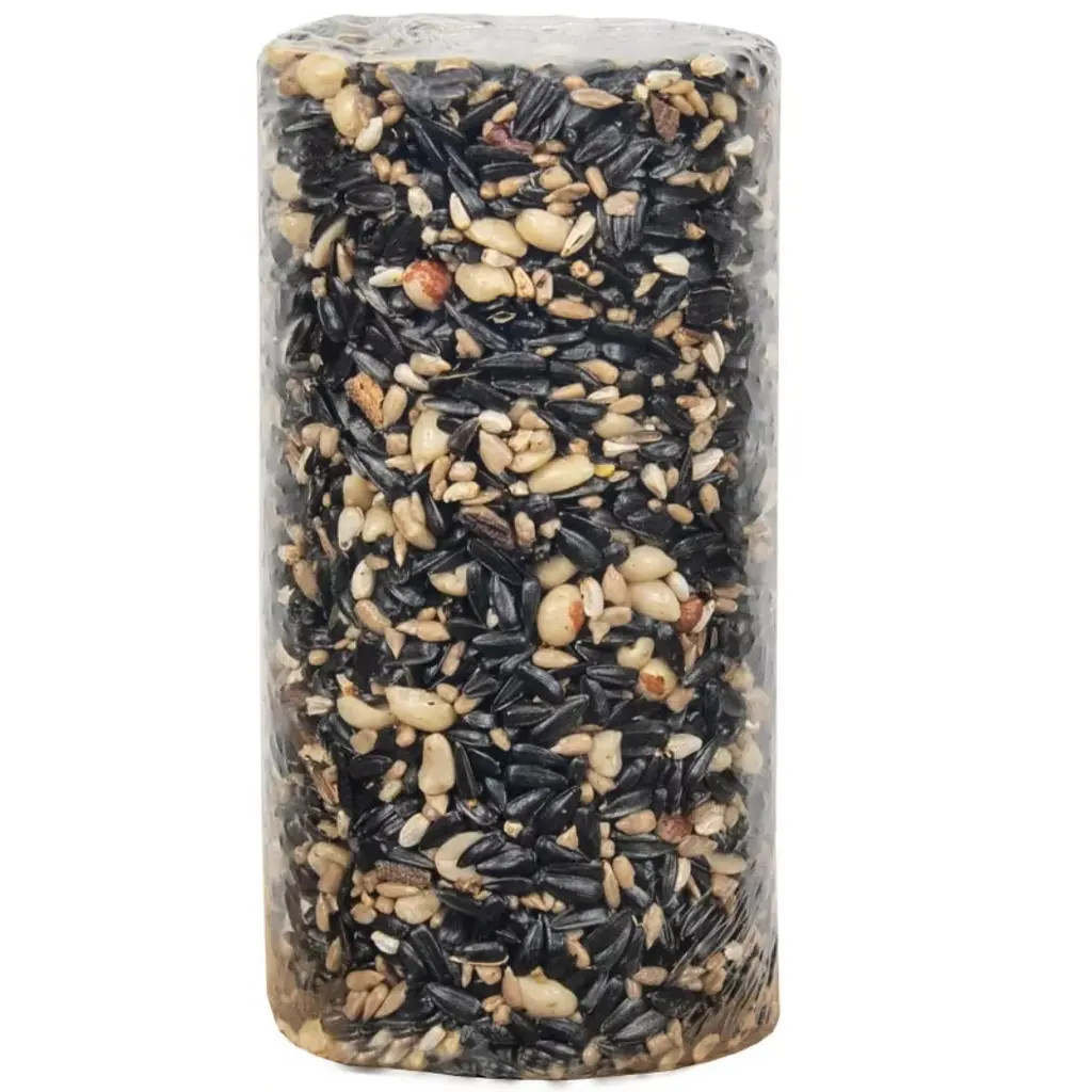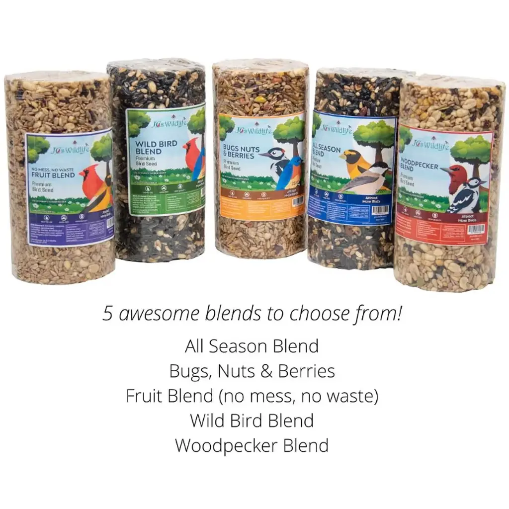 Provide the much-needed energy for your feathered friends with the JCs Wildlife Wild Bird Blend Premium Bird Seed Cylinder! The high-quality mix of seeds and nuts is made by birders for birders right here in the Midwest US. Mess and waste aren't an issue with this blend, which your lawn will be thankful for, as will the birds! This easy-to-use, mess-free cylinder may be used with any cylinder feeder. Birds attracted to this blend: Cardinals, chickadees, woodpeckers, nuthatches, finches, bluebirds, and titmice. You may also notice warblers, wrens, kinglets, and mockingbirds feeding. Ingredients: Black oil sunflower, sunflower chips, shelled peanuts, shelled pecans, safflower, and gelatin Guaranteed Analysis: Crude protein- min 17% Crude fat- min 36% Crude fiber- max 23%