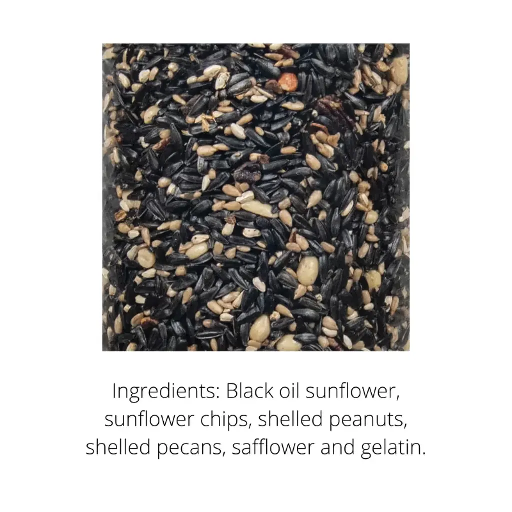 Provide the much-needed energy for your feathered friends with the JCs Wildlife Wild Bird Blend Premium Bird Seed Cylinder! The high-quality mix of seeds and nuts is made by birders for birders right here in the Midwest US. Mess and waste aren't an issue with this blend, which your lawn will be thankful for, as will the birds! This easy-to-use, mess-free cylinder may be used with any cylinder feeder. Birds attracted to this blend: Cardinals, chickadees, woodpeckers, nuthatches, finches, bluebirds, and titmice. You may also notice warblers, wrens, kinglets, and mockingbirds feeding. Ingredients: Black oil sunflower, sunflower chips, shelled peanuts, shelled pecans, safflower, and gelatin Guaranteed Analysis: Crude protein- min 17% Crude fat- min 36% Crude fiber- max 23%