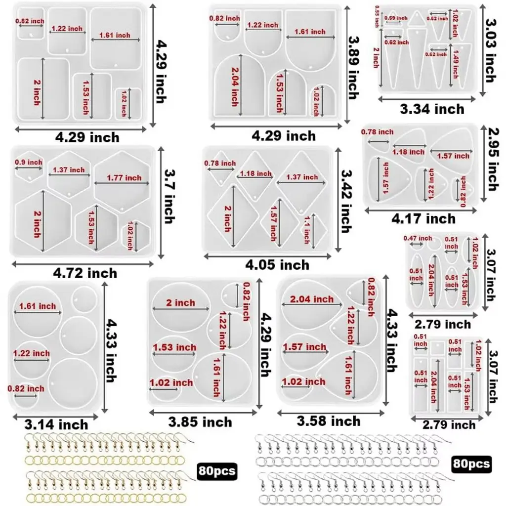【Variety Size Jewelry Casting Molds】: Thes molds set include teardrop circle hexagon oval trianle dangle drop and more shapes, each shape includeds 3 sizes【Premium Silicone Material】:Good flexibility and durable. It has smooth interiors, so the finished pieces are easy to take off from the mold【Multiple Usages】: There are many possibilities with these resin molds set, they can be used to be make resin stud earrings, resin dangle drop, resin keychain pendant【What's in the Package】: 171pcs resin jewelry making kit including 11pcs earrings molds, 40pcs gold earring hooks, 40pcs gold open rings, 40pcs silver earring hooks and 40pcs silver open rings【Suitable for Various Casting Material】: This silicone casting molds are compatible with most casting material such as epoxy resin, UV resin, gypsum, clay, cement