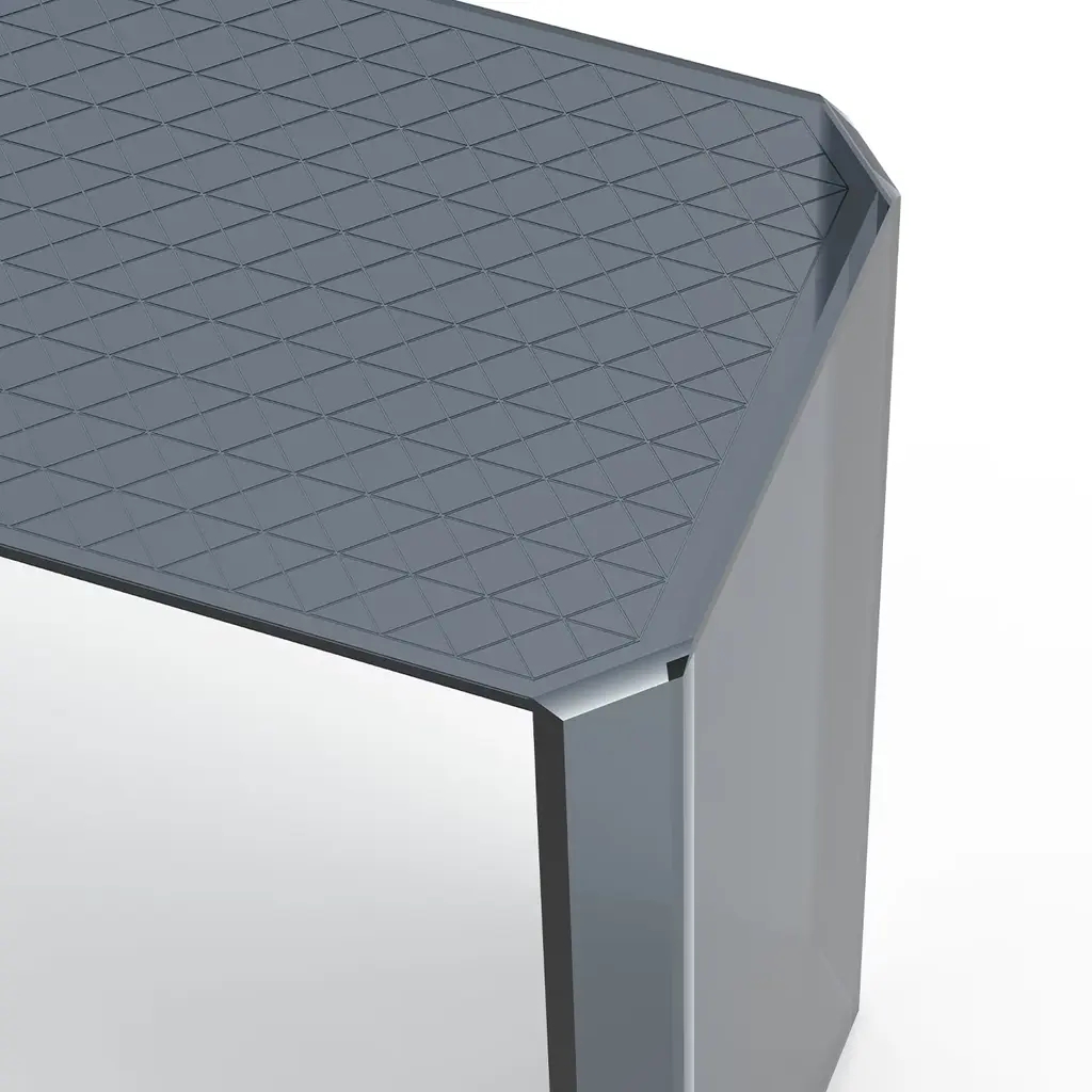 A stylish smoky gray crystal console by Marc Krusin, featuring a refined sandblasted triangle pattern. Available in smoky gray, bronze, or extra-clear glass, the console offers a choice between diamond or triangle patterns, allowing for a personalized touch. The sleek design and subtle detailing make it an ideal piece for modern interiors. Please ask the Concierge for other informations.