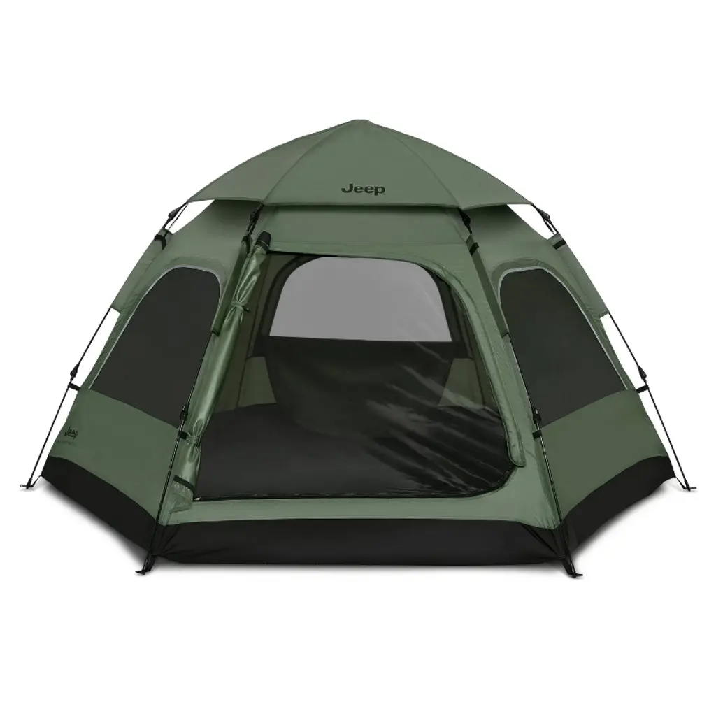Enjoy the great outdoors in comfort with the Jeep Compass 4-Person Pop Up Instant Tent by Delta Children. Its umbrella-style pop-up construction allows for setup in under a minute and folds down compactly for easy storage. Weighing just over ten pounds, this tent is more lightweight than its competition, and comes with a carry bag, ground stakes and guylines, ensuring you have everything you need. Designed to fit a queen-sized air mattress, it’s the perfect option for family camping trips or weekend getaways. Offering 4-season use, this spacious tent features a waterproof tub-style floor, extra-large rainfly, and UPF 50+ protection. Built for adventures in changing conditions, the tent features sturdy support poles to withstand high winds and durable fabrics treated to repel downpours. Three large, mesh windows and zip down front door with magnetic flaps provide expansive views and exceptional airflow. The thoughtful upgrades don't stop there. The Jeep Compass 4-Person Pop Up Tent includes a storage pocket for phones and keys, as well as a built-in hook to hang your camping light. From the first pitch to the final takedown, Jeep’s Compass Tent ensures quick setup, superior durability, and sleek aesthetics.