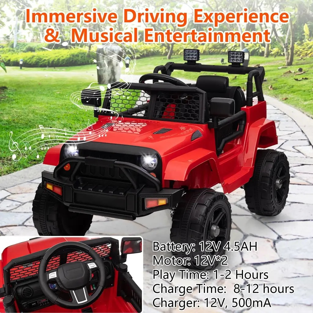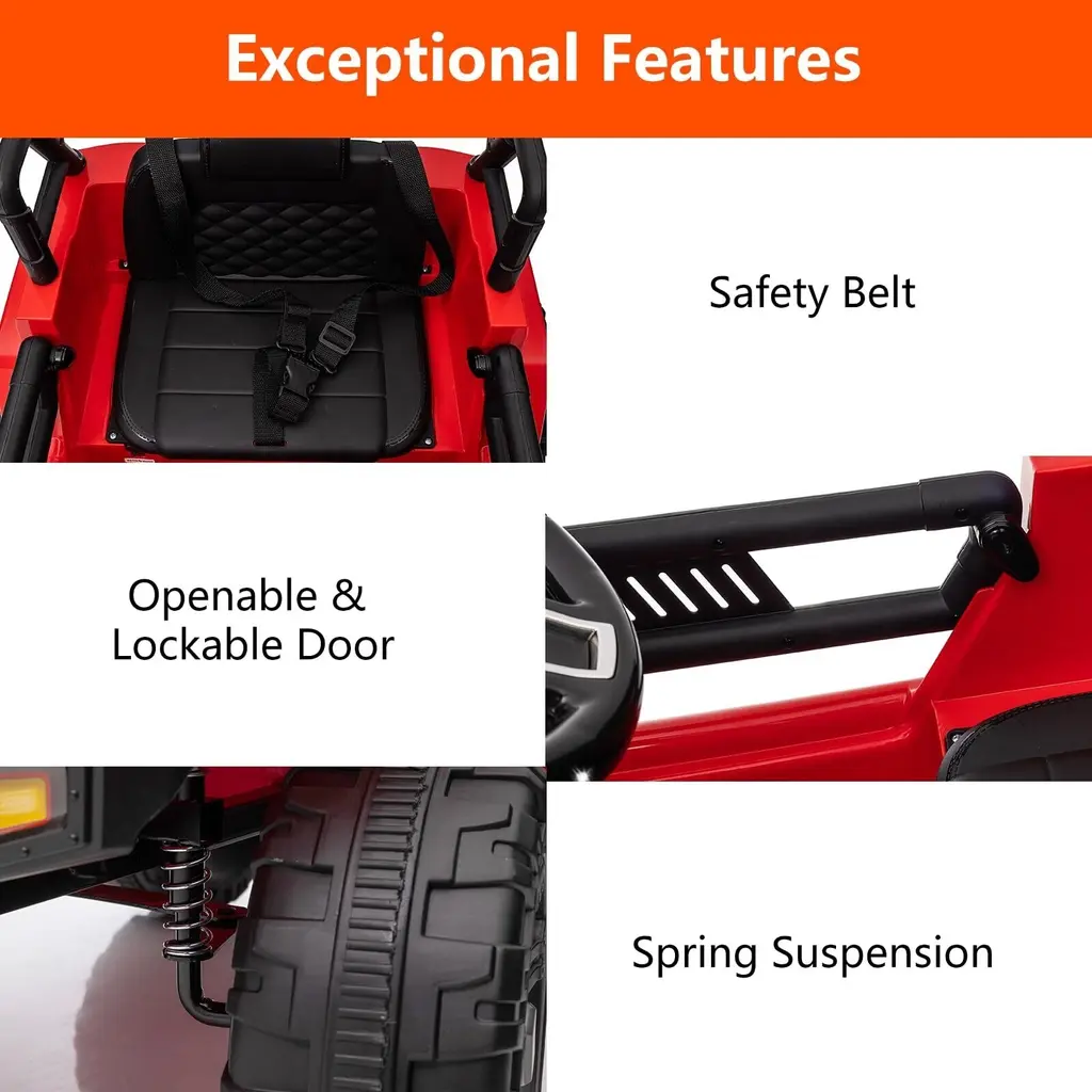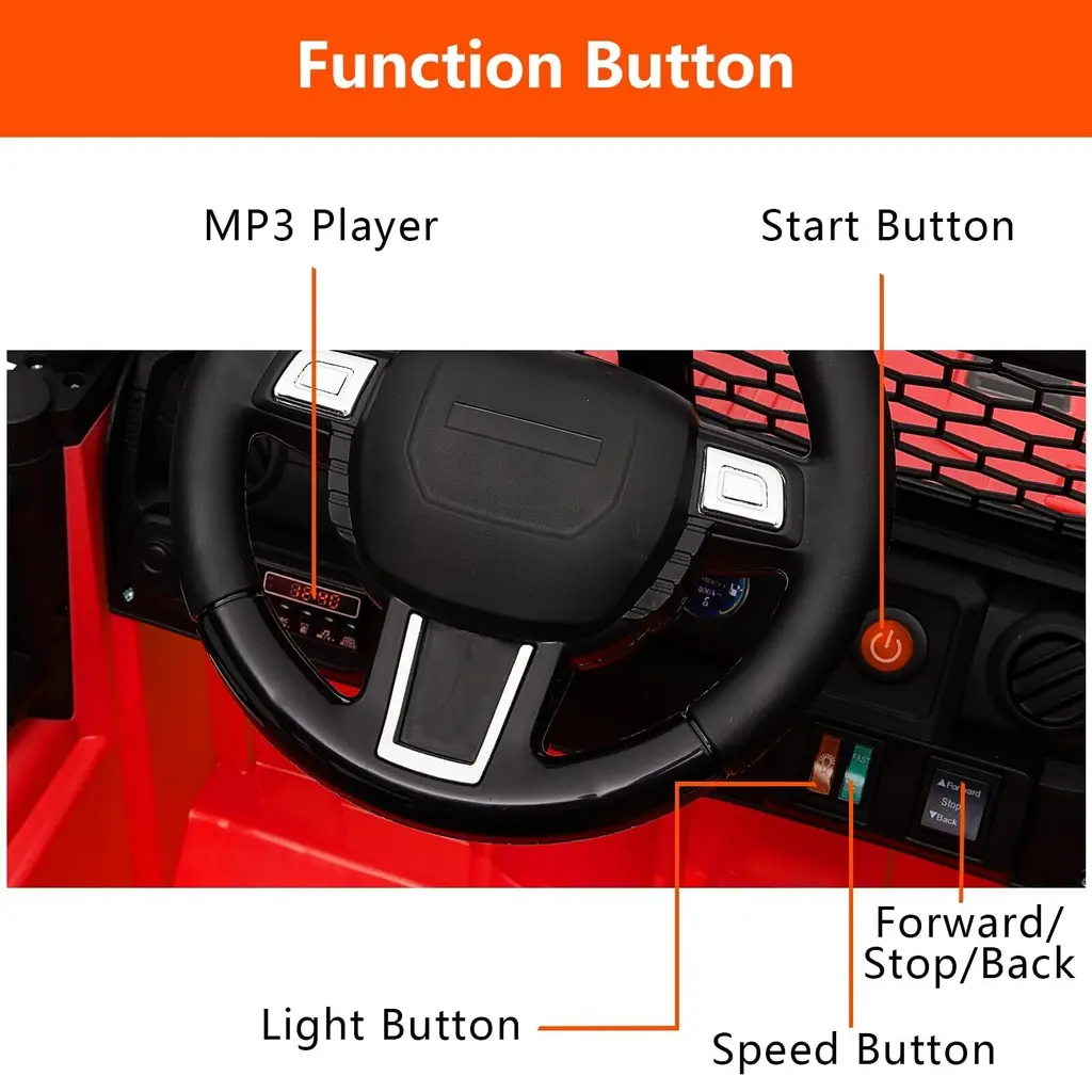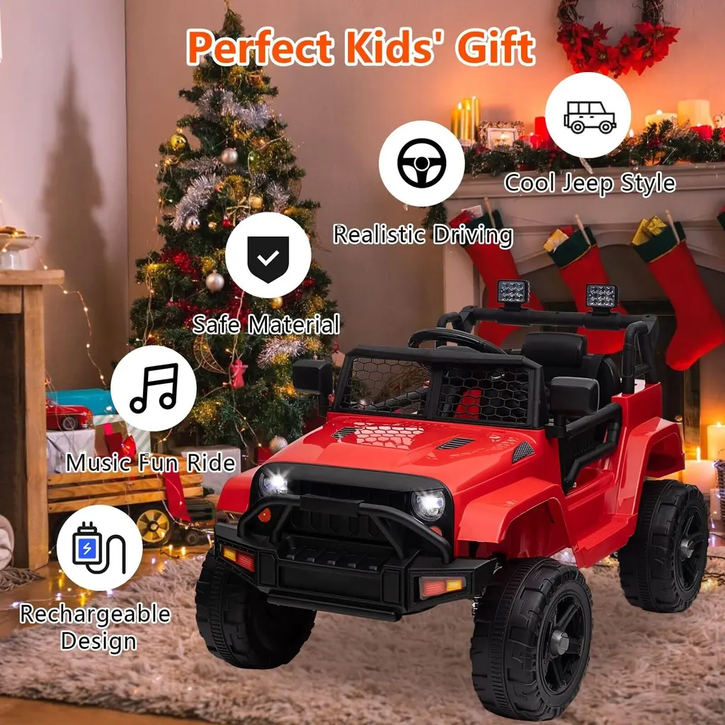 🚗Ride on Toys for Kids 3+ Years Old: This power wheels jeep car is ideal for your young racers who aspire to drive like the adults do! 🚗Manual & Parent Remote Control: Allow your child to drive manually or use the remote control to safely guide them yourself; the remote provides forward/reverse controls. 🚗Powerful 12V & Realistic Desigh: Equipped with adjustable seatbelts, LED headlights, lockable doors, Music Play and Spring Suspension for off-road style, it features a 12V motor and traction tires for various terrains. 🚗Safe & Durable: Comes with plastic wheels that never deflate, a spring suspension system, and a secure 2.8mph max speed for smooth rides on outdoor adventures. 🚗Connect Your Music: A built-in AUX outlet enables kids to plug in media devices and drive while enjoying their own choice of music; Product Dimensions: 39"(L) x 26"(W) x 26"(H); Weight Capacity: 66 lbs.