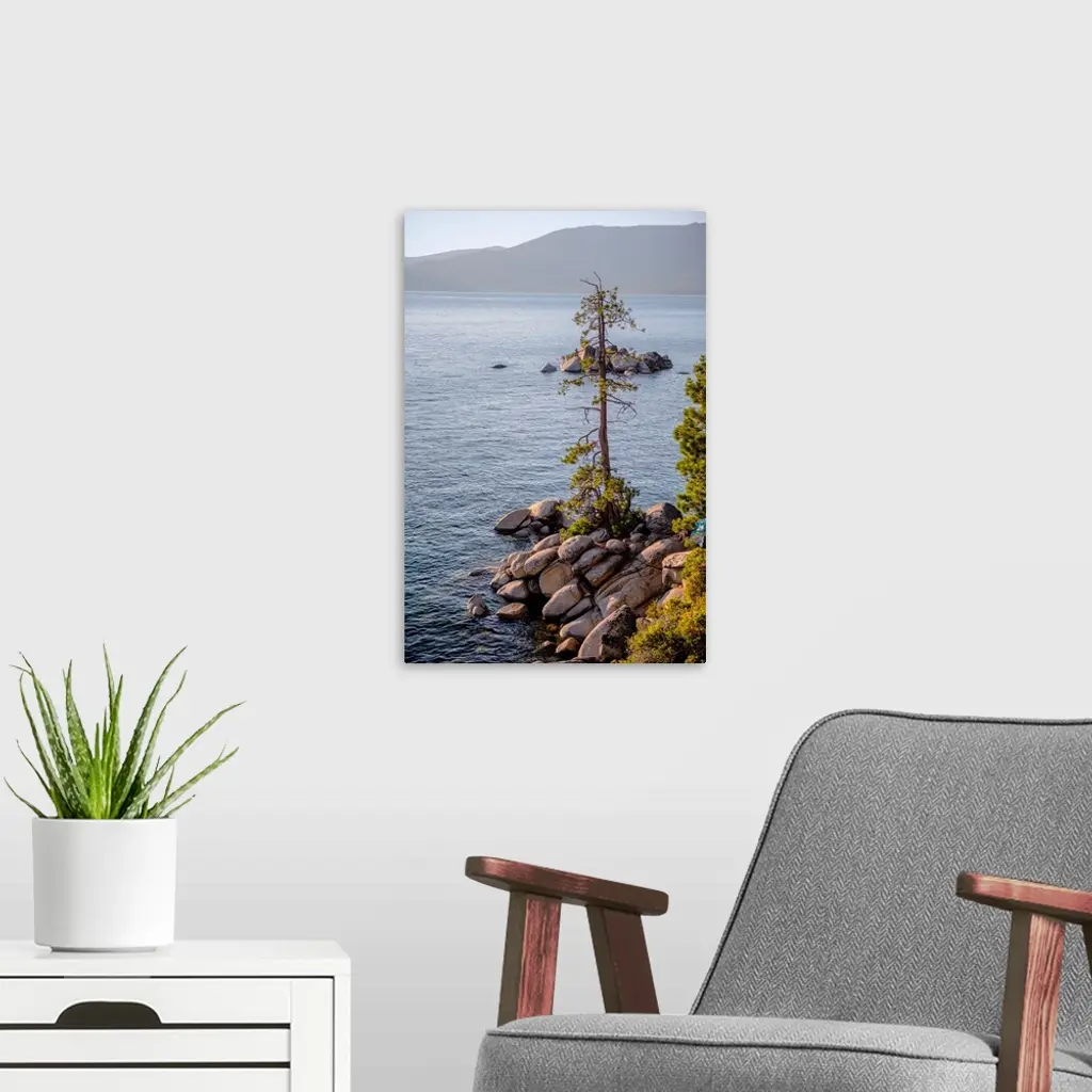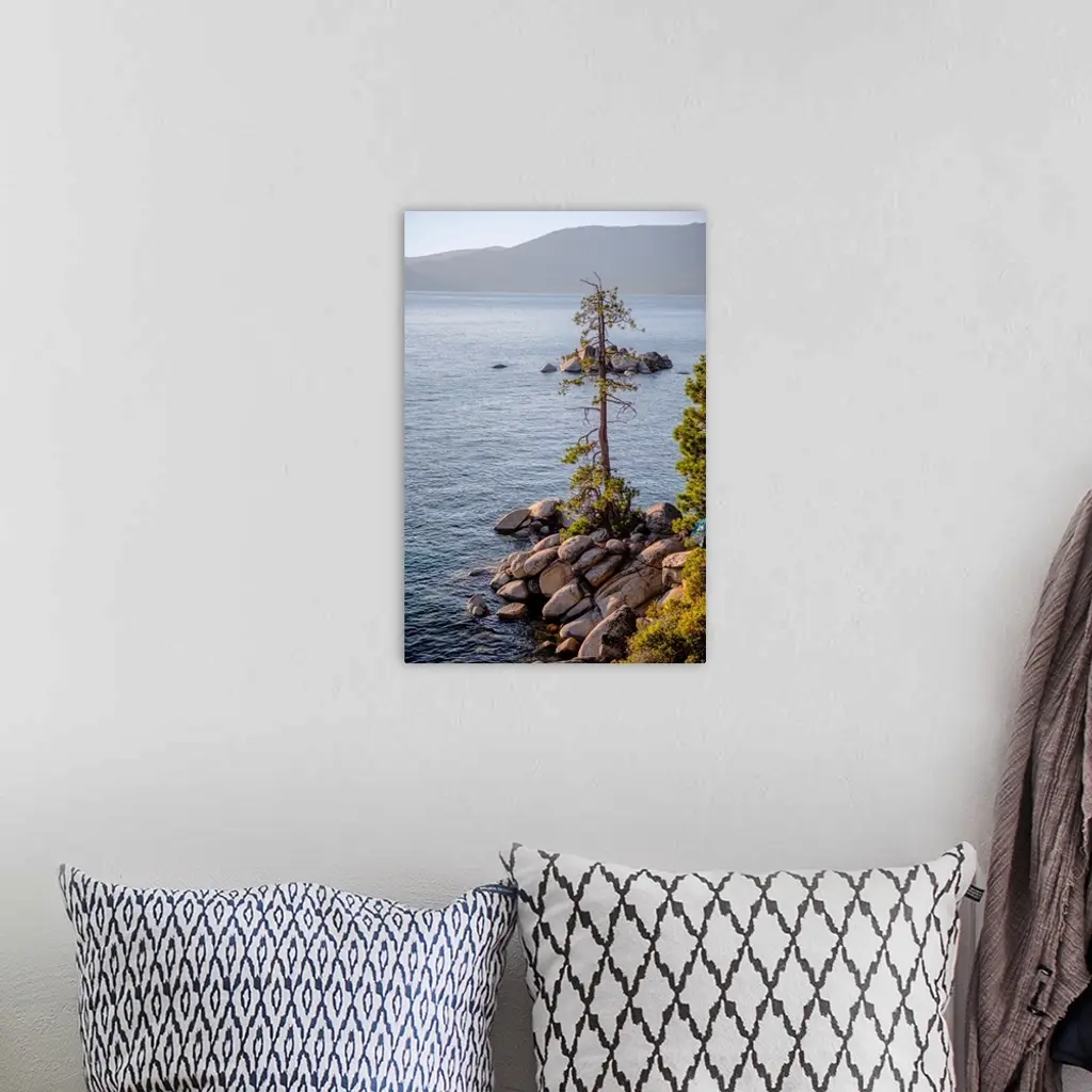 A lone tree has grown out of rocky shore at Lake Tahoe in California and Nevada.