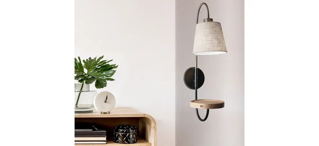 A wall lamp that can provide lighting, storage and a charging station all in one can be found in the Jeffrey collection. An antique brass finish with black accents and a beautiful textured off-white fabric shade make the Jeffrey Wall Lamp not only extremely functional, but stylish as well. A 7" natural wood round shelf has a catch-all rim for efficient storage and 1 USB port to charge your smart devices. This lamp can either be hardwired or used as a portable plug-in wall lamp with a decorative black fabric covered cord. A rotary switch located above the socket turns the lamp on and off. This lamp is smart outlet compatible. Bulb is not included.