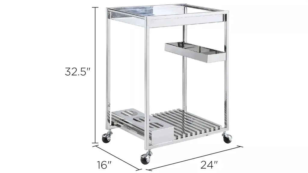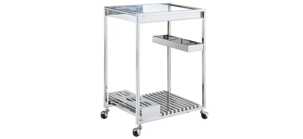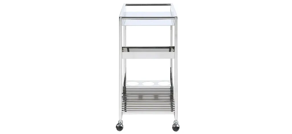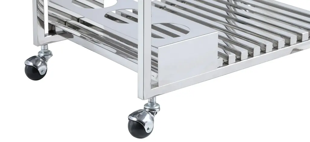 Constructed with a solid, polished stainless steel frame and supported by four durable casters, this Jeffry bar cart with wine storage features several user friendly compartments. The handle is conveniently located adjacent to the top, most accessible storage tray.