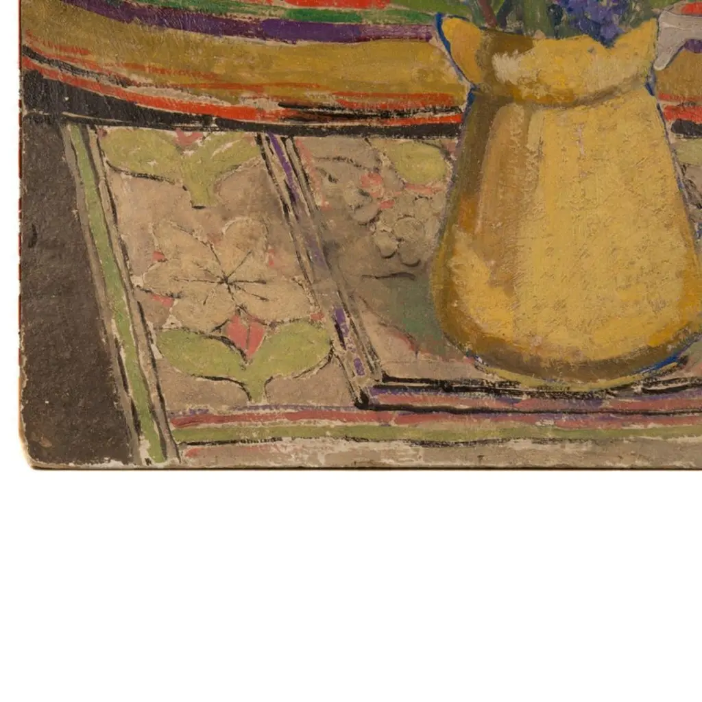 Jeka Kemp (Scottish,1876–1966) "No 6 Fleurs", Still Life depicting orange lilies, blue, purple and white flowers in a yellow pitcher, sitting atop a table with fabric draped in the background, oil on artist board, signed lower right, unframed.