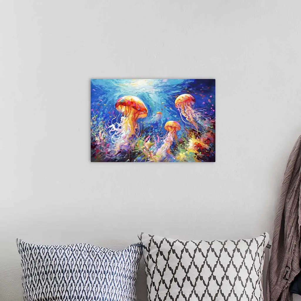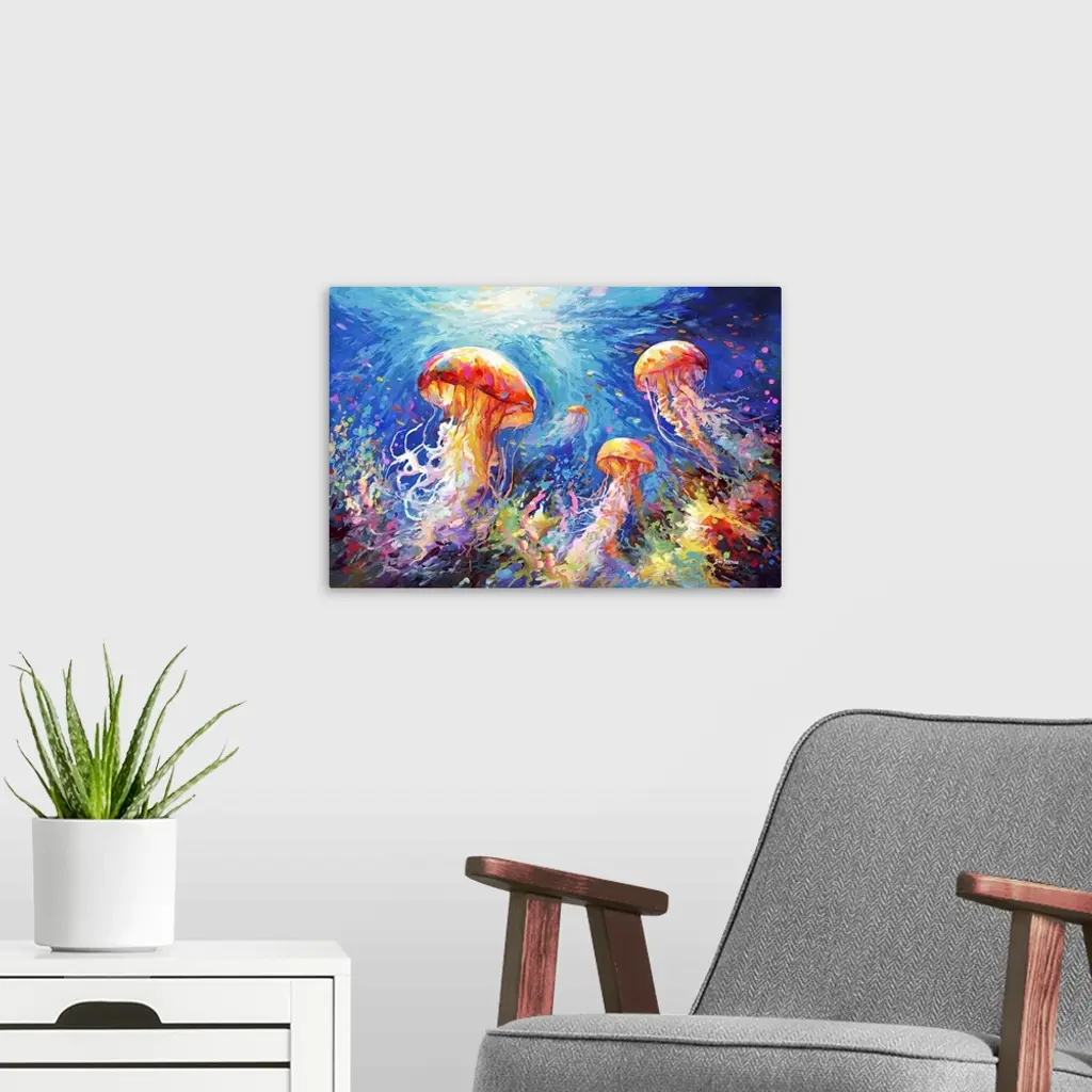 This contemporary impressionistic piece captures the ethereal beauty of jellyfish gliding through the ocean's depths, surrounded by a dance of vibrant, swirling colors and the intricate presence of coral, making it an enchanting addition that brings the wonder of marine life to any living space.