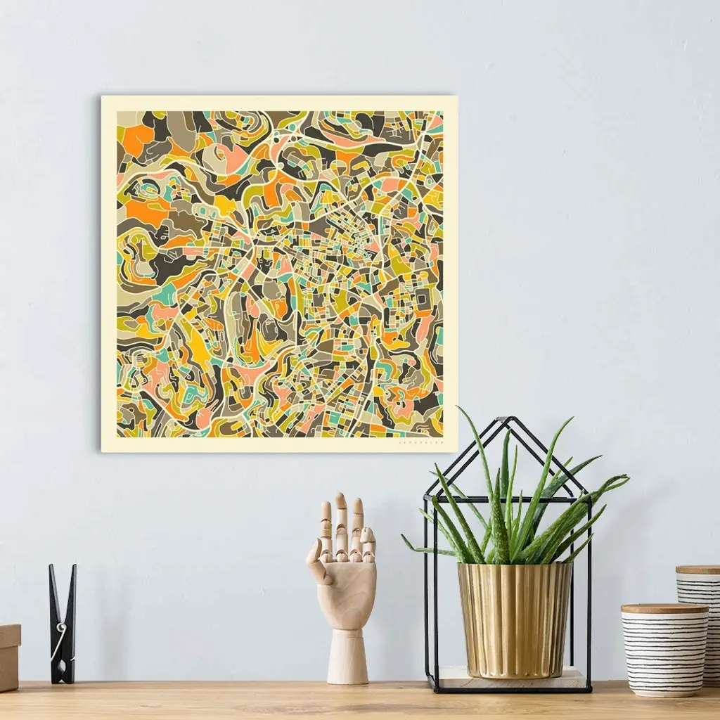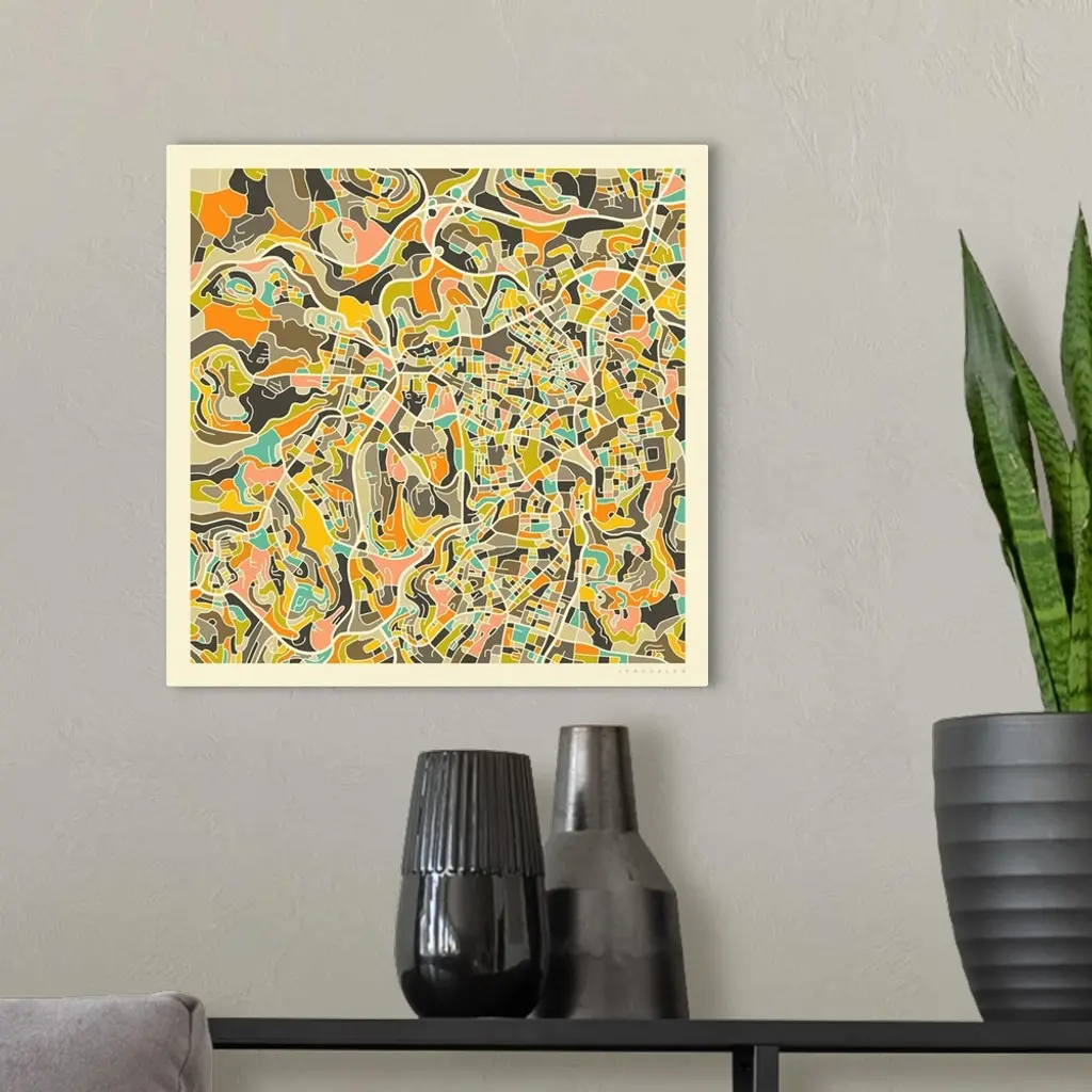Colorfully illustrated aerial street map of Jerusalem, Israel on a square background.