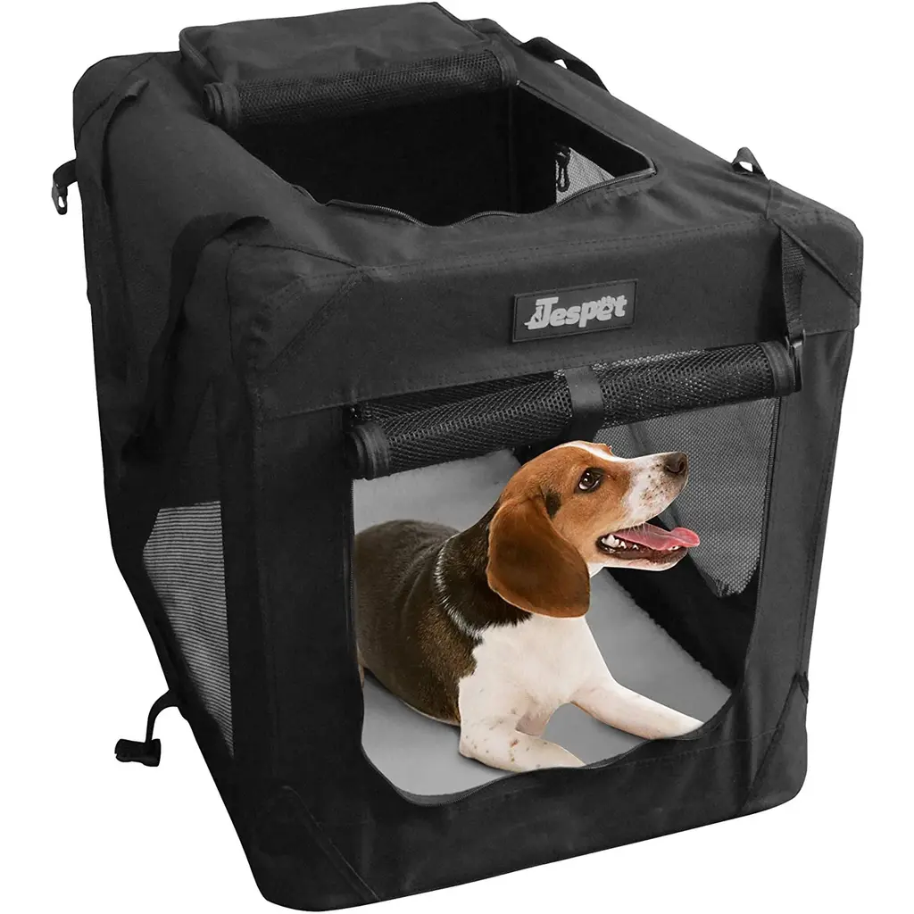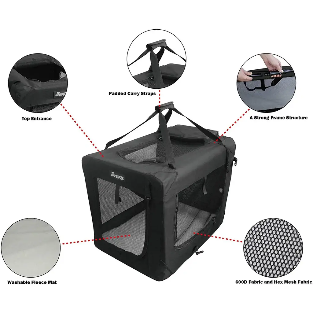 Jespet Folding Soft-Sided Dog Crate are made with flexible fabrics such as nylon, which makes them lighter and easier to carry around, as well as allowing them to be folded for storage when not in use. This portability makes them perfect as travel crates for dogs. In addition, the soft dog crates usually have mesh panels on sides, which not only provides your pet with greater ventilation, they also allow him increased visibility, which can be more reassuring when he is in the crate. 1. Foldable and Lightweight Pet Carrier make it easier for outdoor travel. 2.Three Entrances Door (Top, front and side) for convenience sunlight and breathability; Ample Ventilation for Use in All Season. 3. The crate frame is make of strong steel tube; the carte cover is made of Durable washable 600D fabric and hex mesh fabric; a well ventilated, stylish, lightweight and durable crate.